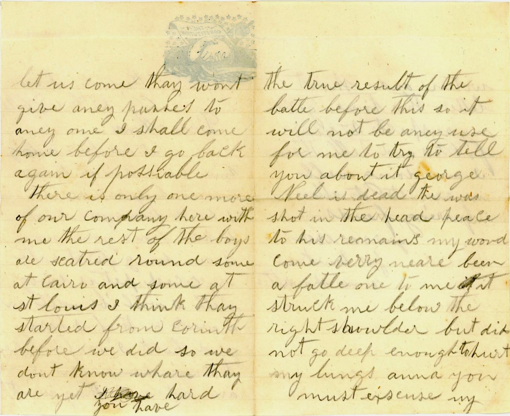 You have heard the true result of the Battle [of Corinth] before this so it will not be any use for me to try to tell you about it. [Lt.] George Neal is dead. He was shot in the head. Peace to his remains. My wound come very near being a fatal one to me. It struck me below the right shoulder but did not go deep enough to hurt my lungs.