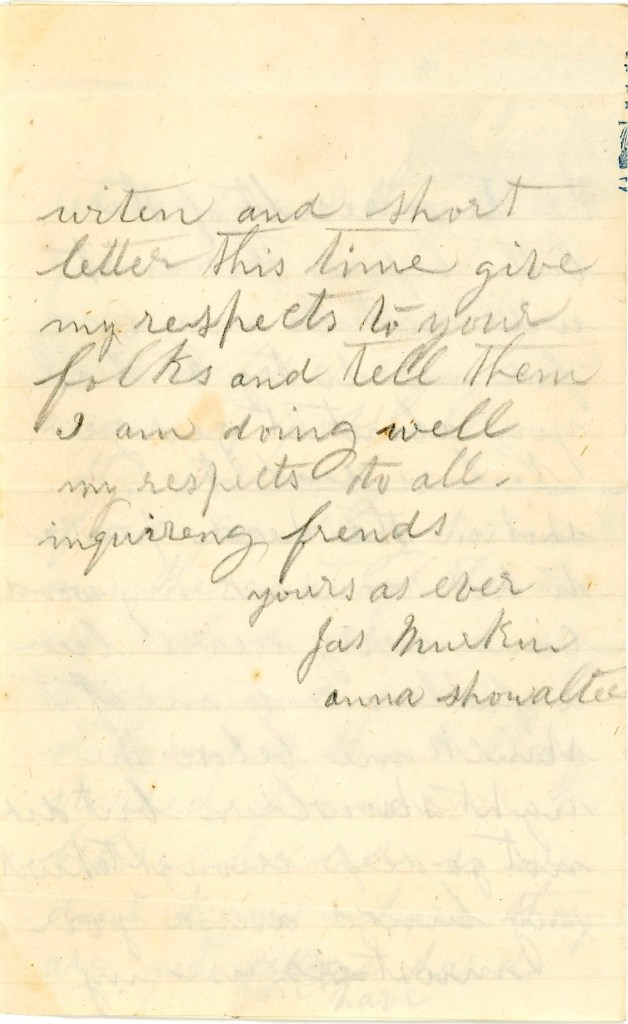 Anna, you must excuse my writing and short letter this time. Give my respects to your folks and tell them I am doing well. My respects to all enquiring friends, Yours as ever, — Jas. Murkin