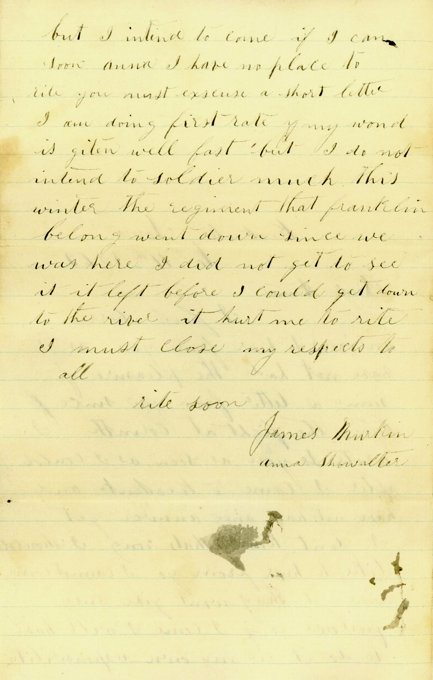 The regiment that [your brother] Franklin belongs to went down since we was here. I did not get to see it. It left before I could get down to the river. It hurts me to write. I must close. My respects to all. Write soon. — James Murkin