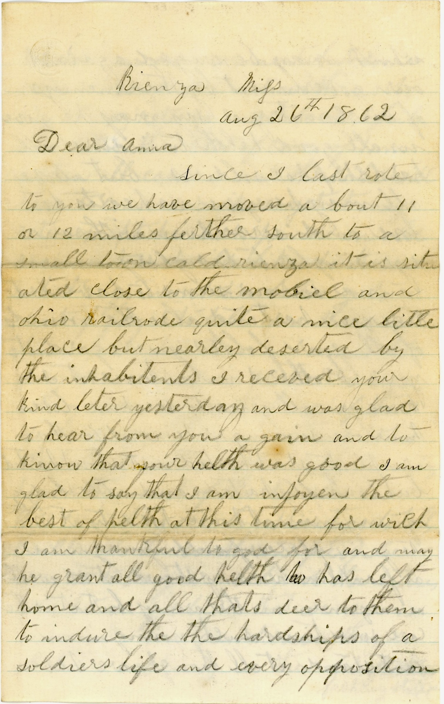 Since I last wrote to you, we have marched about 11 or 12 miles further south to a small town called Rienza. It is situated close to the Mobile & Ohio Railroad—quite a nice little place but nearly deserted by the inhabitants. I received your kind letter yesterday and was glad to hear from you again and to know that your health was good. I am glad to say that I am enjoying the best of health at this time for which I am thankful to God for and may He grant all good health to those left at home and all that’s dear to them, to endure the hardships of a soldier’s life and every opposition which may be waged against our government by the enemies of our country. I say may He give us all good health to endure all hardships as soldiers. But above all, me He give us hearts to love and serve Him with an eye single to His glory.