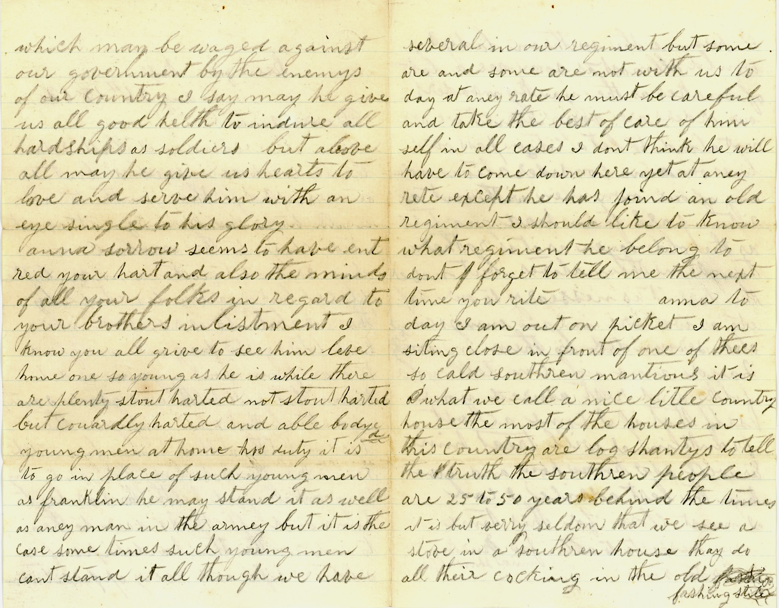 Anna, sorrow seems to have entered your heart and also the minds of all your folks in regard to your brother’s enlistment. I know you all grieve to see him leave home, one so young as he is, while there are plenty stout-hearted—not stout-hearted, but cowardly-hearted and able-bodied young men at home whose duty it is to go in place of such young men as Franklin. He may stand it as well as any man in the army, but it is the case sometimes such young men can’t stand it although we have several in our regiment. But some are and some are not with us today. At any rate, he must be careful and take the best of care of himself in all cases. I don’t think he will have to come down here yet at any rate except he has joined an old regiment. I should like to know what regiment he belongs to. Don’t forget to tell me the next time you write.