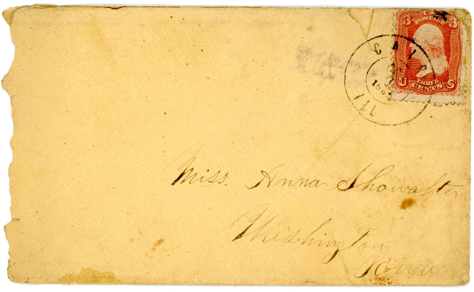 The following stampless letter was written by Oscar Martin Burke (1824-1902) and his new bride, Martha Caroline Meech (1824-1902). They were married on 23 June 1847 in Newburgh, Cuyahoga county, Ohio, and we learn from this letter that they soon after made the journey to Oscar’s farm near the village of Libertyville in Lake county, Illinois—approximately 37 miles from Chicago. The route from Cleveland to Libertyville was made by a direct journey across the upper Great Lakes, consisting of sailing or steaming west across Lake Erie, passing through the Strait of Mackinac into Lake Michigan and then traveling south along the western shore. Although the couple called the village “new,” it had already passed through several name changes prior to their arrival. It was first settled around 1834–1835 as Vardin’s Grove. It was renamed Independence Grove in 1836 and Libertyville in 1837. In 1839, Libertyville was made the county seat and renamed Burlington until the county seat was moved to Little Fort (now Waukegan) in 1841. At that time, the Village reclaimed the name Libertyville.