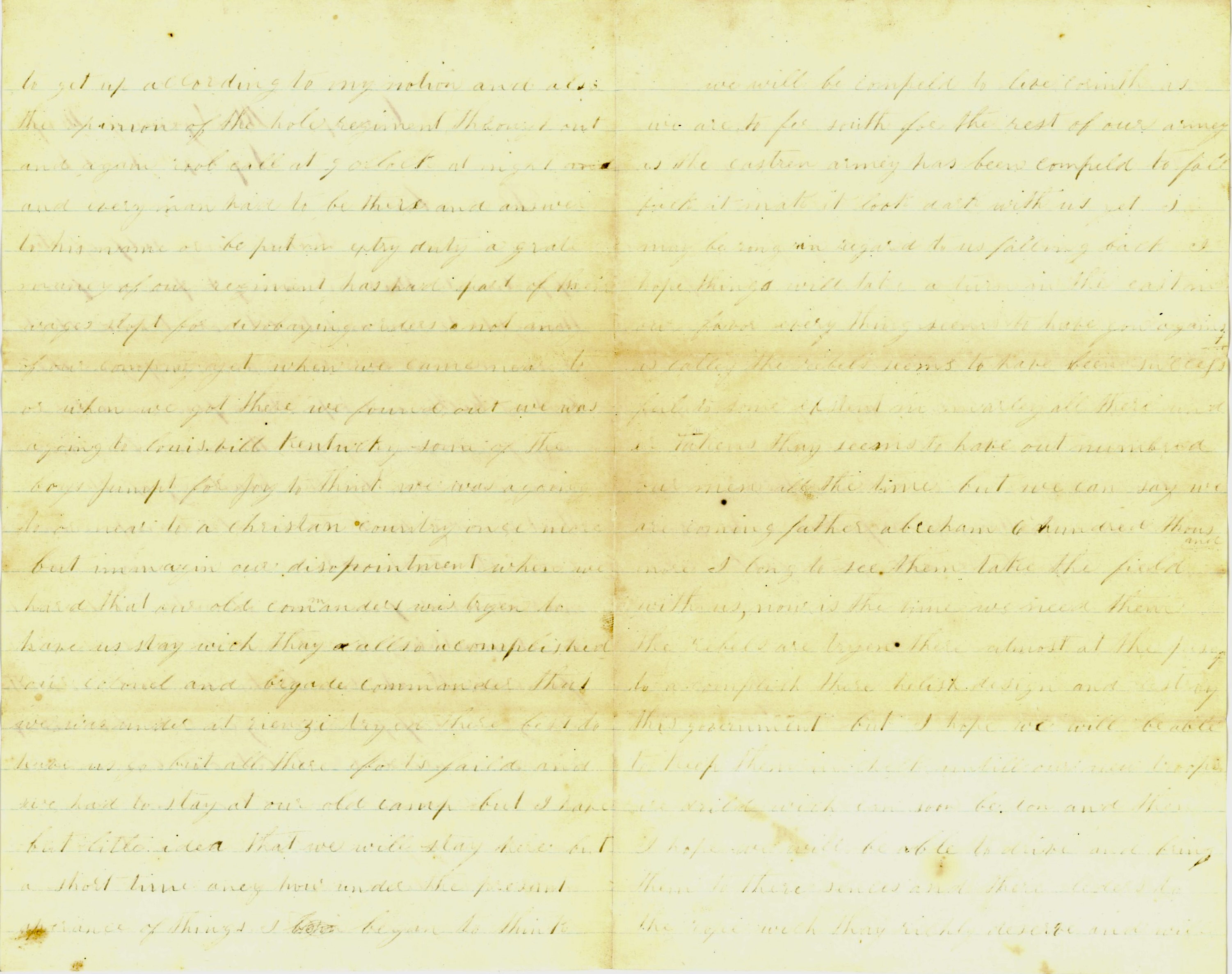 When we came near to or when we got there, we found out we was a going to Louisville, Kentucky. Some of the boys jumped for joy to think we was a going to or near to a Christian country once more but imagine our disappointment when we heard that our old commanders was trying to have us stay which they also accomplished. Our Colonel and Brigade Commander that we were under at Rienzi tried their best to have us go but all their efforts failed and we had to stay at our old camp. But I have but little idea that we will stay here but a short time anyhow under the present appearance of things. I began to think we will be compelled to leave Corinth as we are to far south for the rest of our army as the eastern army has been compelled to fall back…