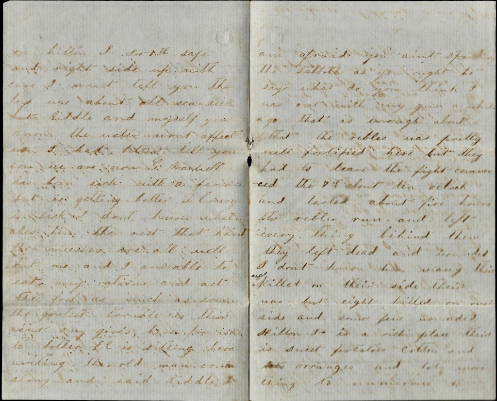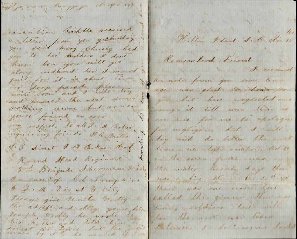 Hilton Head is a rich place. There is sweet potatoes, cotton and oranges and lots more things too numerous to mention. Riddle received a letter from you yesterday. You said Mary Christy had gone to her mother’s. I don’t know how you will get along without her. I must quit for it is about time for dress parade.