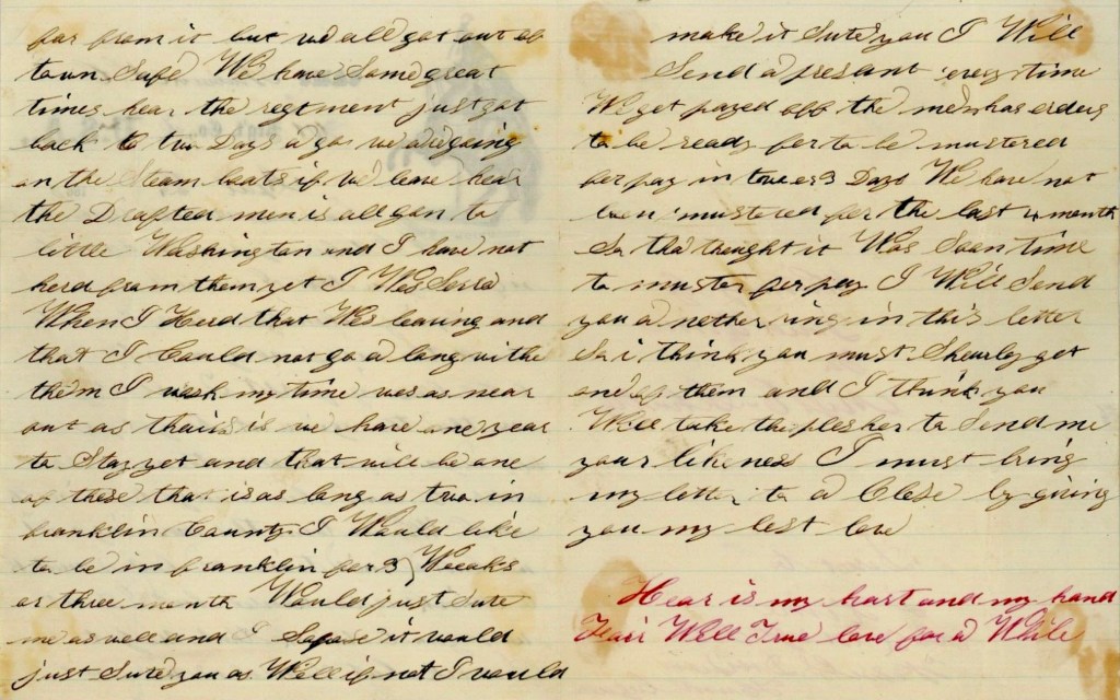 I must stop this and tell you something more and that is this. This day, I express you fifty dollars. We got fifty-two dollars paid us on the fifth of this month and I would have sent you this money home before this time but I could not get it sent. We are looking for two more months more pay every day and that will pay us up for last year. This fifty dollars that I send now is to you and the children, twenty-five dollars to you, and five dollars to Samuel and five dollars to Mandana and five dollars to Belle and the baby and the other five lay it away and if we get our other two months pay you may look for twenty dollars more sent to you.
