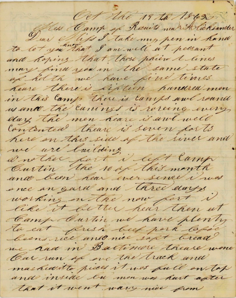 This letter was written by James Baker (1831-1864) of Co. C, 101st Pennsylvania Infantry. James enlisted as a private on 20 December 1861 for three years. He re-enlisted as a veteran in the winter of 1863-64 and was one among many of his regiment surrendered at the Battle of Plymouth on 18 April 1864 and taken to Andersonville Prison. He died there four months later on 20 August 1864 and was buried in grave 6061. Also mentioned in this letter was John H. Baker who was also taken prisoner at Plymouth and who died at Florence, S. C., on 15 February 1865.