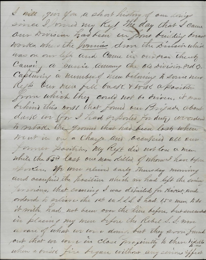 I will give you a short history of our doings since I joined my regiment. The day that I came, our Division had been in front building breastworks when the Johnnies drove the Division which was on our left and came in our rear thereby causing a panic among the old division Red Diamond, capturing a number of men belonging to some new regiments. Our men fell back & took a position from which they could not be driven. It was behind this work that [I] found our Brigade about dark. We (for I had reported for duty) were ordered to retake the ground that had been lost when [we] went in on a charge and occupied all our former position. My regiment did not lose a man while the 63rd lost one man killed of whom I have before spoken. We were relieved early Thursday morning and occupied the position which we had left the evening previous. That evening I was detailed for picket and ordered to relieve the 1st U.S. Sharpshooters. I had 150 men to do it with, Had not been over the line before but succeeded in placing my men before the Rebel sharpshooters were aware of what we were doing. But they soon found out that we were in close proximity to their vedettes when a brisk fire began without any serious affect to us.