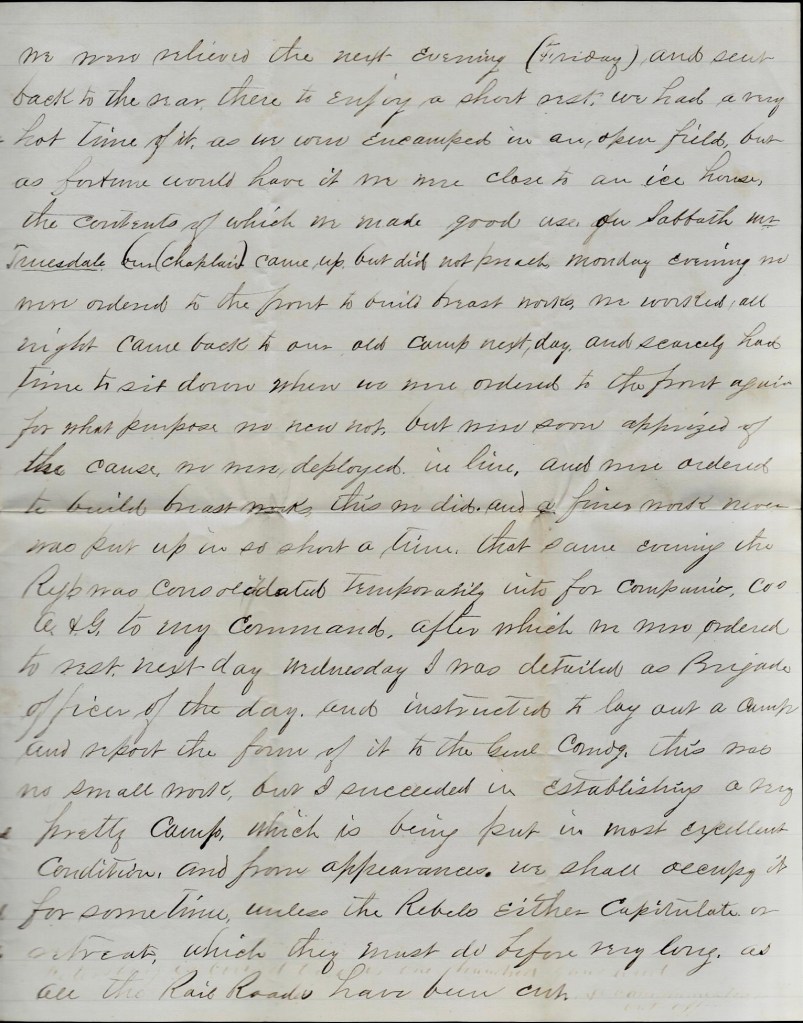 We were relieved the next evening (Friday) and sent back to the rear, there to enjoy a short rest. We had a very hot time of it as we were encamped in an open field but as fortune would have it, we were close to an ice house, the contents of which we made good use. On Sabbath, Mr. Truesdale (our chaplain) came up but did not preach. Monday evening we were ordered to the front to build breastworks. We worked all night, came back to our old camp next day and scarcely had time to sit down when we were ordered to the front again—for what purpose we knew not, but were soon apprised of the cause. We were deployed in line and were ordered to build breastworks. This we did and a finer work never was put up in so short a time.
