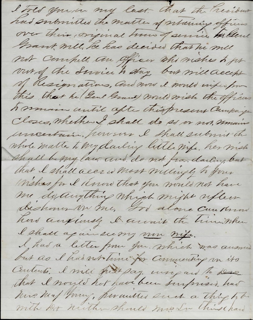 I told you in my last that the President had submitted the matter of returning officers over their original term of service to General Grant. Well, he has decided that he will not compel any officer who wishes to get out of the service to stay, but will accept of resignations. And now I would infer from this that he (General Grant) would wish the officers to remain until after the present campaign closes, whether I shall do so or not, remains uncertain. However, I shall submit the whole matter to my darling little wife. Her wish shall be my law and do not fear, darling, but that I shall accede most willingly to your wishes for I know that you would not have me do anything which might reflect dishonor on me. God alone can know how anxiously I await the time when I shall again see my now wife.