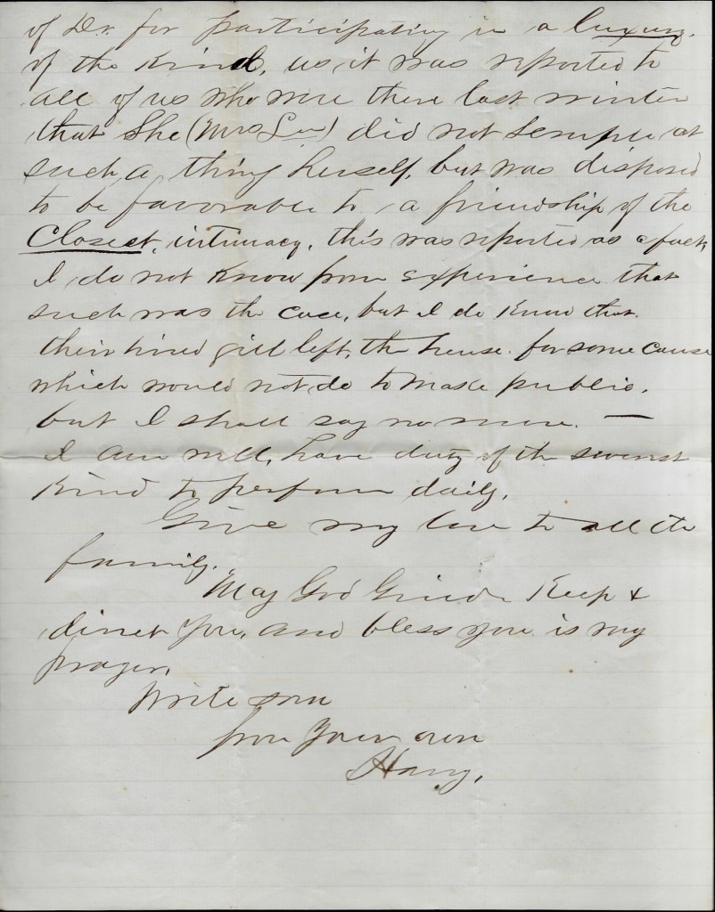 I had a letter from you which was answered but as I had not time for commenting on its contents, I will just say was good to see that I would not have been surprised had Mrs. Maj. Young permitted such a thing to be with Dr. Neither should Mrs. L’n think hard of Dr. for participating in a luxury of the kind as it was reported to all of us who were there last winter that she (Mrs. L’n) did not [ ] at such a thing herself but was disposed to be favorable to a friendship of the closest intimacy. This was reported as a fact. I do not know from experience that such was the case, but I do know this—their hire girl left the house for some cause which would not do to make public. But I shall say no more.