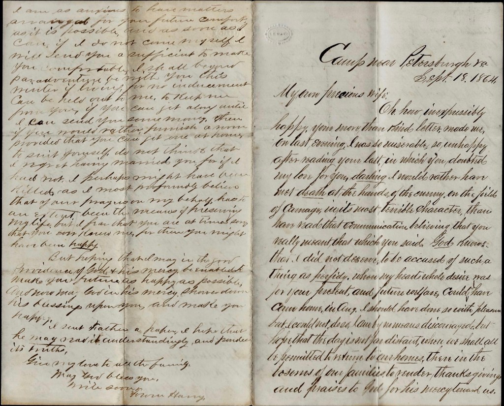I am well. Have duty of the severest kind to perform daily. Give my love to all the family. May God keep and direct you and bless you is my prayer. Write soon. From your own, — Harry