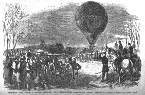 A lithograph appearing in Harper’s Weekly on 14 December 1861 depicting Professor Lowe’s balloon ascension on a “reconnoitering expedition to Vienna.”