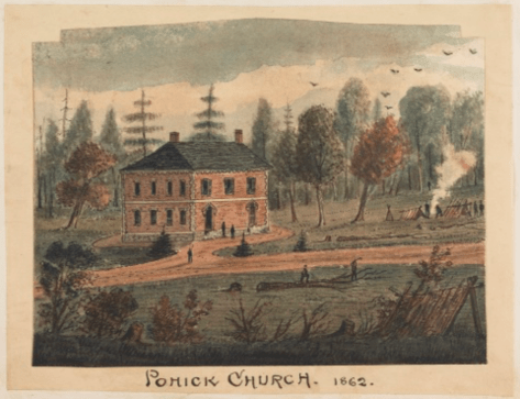The church to which we marched was built by General George Washington. I cannot give a description of it except its outside appearance as I was not permitted to leave the ranks to look at it, but as our company was sent on ahead half mile past it, I had a chance of seeing how it looked outside. It is built of brick which are said to have come from England. The corners were of stone all the way up. The roof was four square coming to a point at the top. One of the artillery men had sent into it and had taken one of the banisters which was around the altar. He gave me a piece which I enclose to you.