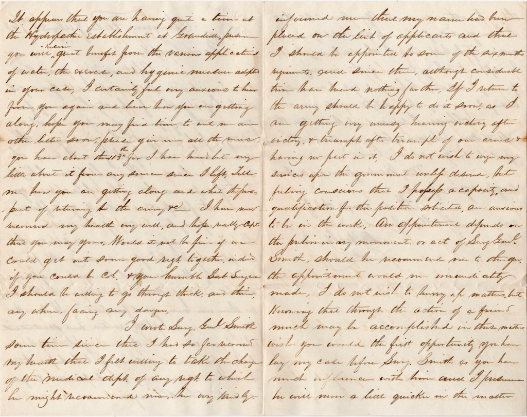 I write Surgeon General Smith some time since that I had so far recovered my health that I felt willing to take charge of the Medical Department of any regiment to which he might recommend me. He very kindly informed me that my name had been placed on the list of applications and that I should be appointed to some of the six-month’s regiments, and since then, although considerable time have heard nothing further. If I return to the army, should be happy to do it soon as I am getting very uneasy hearing victory after victory, and triumph after triumph of our arms & having no part in it. I do not wish to urge my services upon the government unless desired, but feeling conscious that I possess a capacity and qualification for the position solicited, am anxious to be in the work.