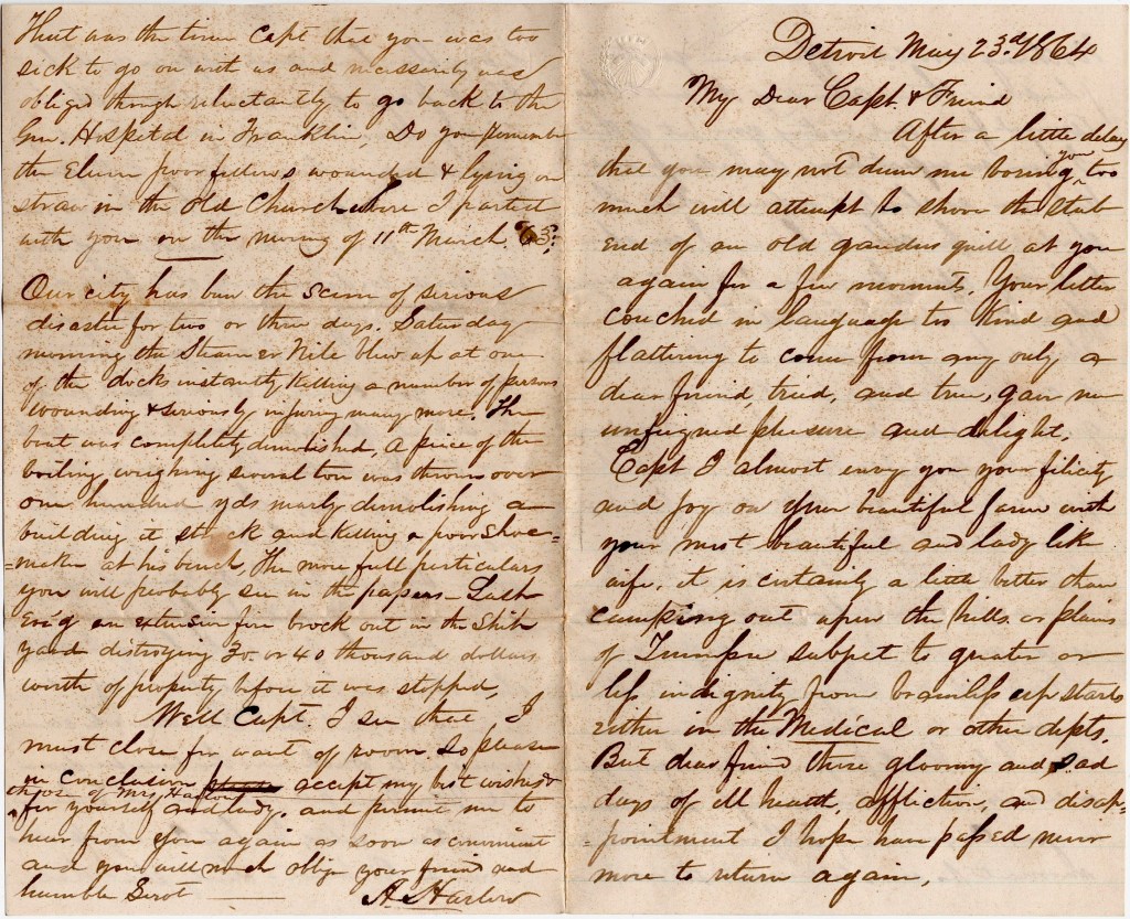 I certainly feel very anxious to hear from you again and learn how you are getting along. Hope you find time to write me another letter soon. Please give me al lthe news you have about the 113th OVI for I have heard but very little about it from any since I left. Tell me how you are getting along and what the prospect of returning to the army, &c. I have now recovered my health very well and hope, really Captain, that you may yours. Would it not be fine if we could get into some good regiment together. Indeed, if you could be Colonel & your humble servant Surgeon, I should be willing to go through thick and thin, anywhere, facing any danger.