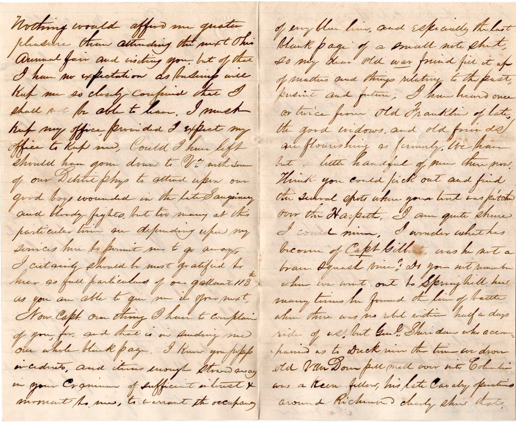 I wonder what has become of Capt. [Charles Champion] Gilbert? Was he not a brain squash vine? Do you not remember when we went out to Spring Hill how many times he found the line of battle when there was no rebel within half a day’s ride of us? But General Sheridan who accompanied us to Duck River the time we drove old Van Dorn pell mell over into Columbia was a keen fellow. His late cavalry operations around Richmond clearly shows that. That was the time, Captain, that you was too sick to go out with us and necessarily was obliged though reluctantly to go back to the General Hospital in Franklin. Do you remember the eleven poor fellows wounded and lying on straw in the Old Church where I parted with you on the morning of the 11th March ’63.