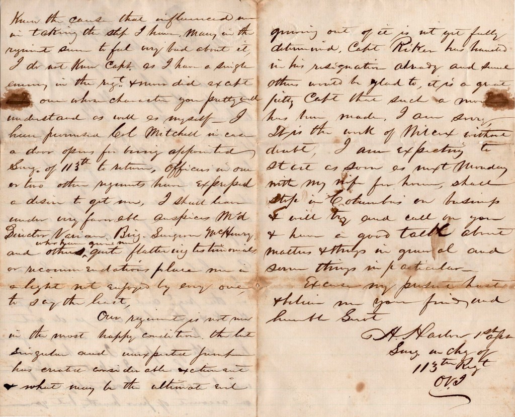 Excuse my present haste and believe me your friend and humble servant. —A. Harlow, Asst. Surgeon in charge of 113th Regt. O. V. I.