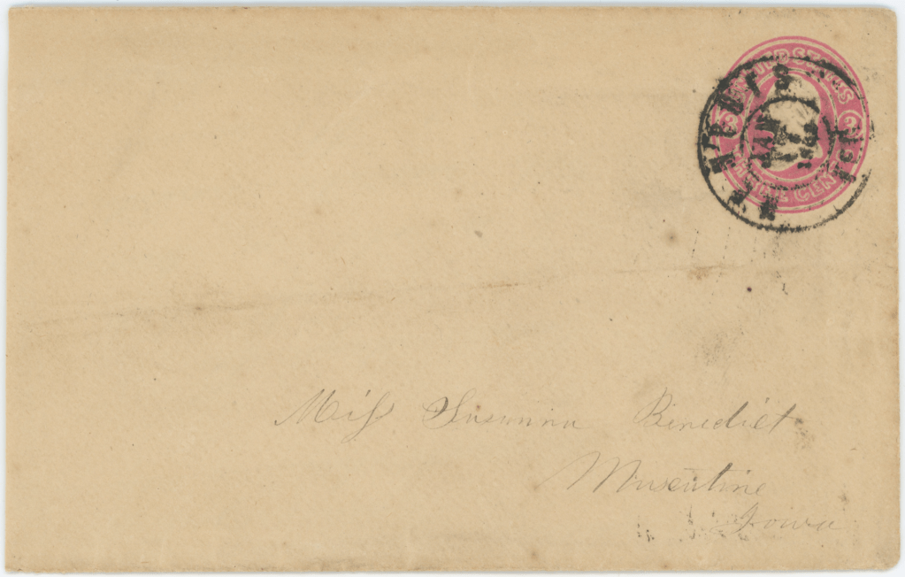 The following letter was written by William Fletcher Lehew (1821-1892), son of Thomas Lehew and Catherine Fletcher of Zanesville, Ohio. On 28 October 1841, William and Mary Roberts were married in Muskingum County, Ohio. In 1850, census records show William and wife Mary living in Union Town, Newton Township, Muskingum County, Ohio. By 1857, William and Mary had moved with their four children from Ohio to Henry County, Iowa.