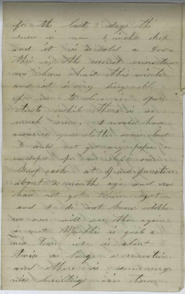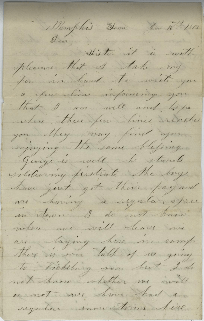 With reference to my whereabouts, I am here in the capacity of a soldier in the Eleventh Iowa Regiment of infantry, second in command of Co. G from Henry county, Iowa. I live when at home near Mt. Pleasant, Henry county, Iowa, a neighbor to the Hon. J[ames] Harlin. I have been over six months in the service and have seen service. Our regiment was sent here on the first of January and have succeeded in the purpose for which we was sent.