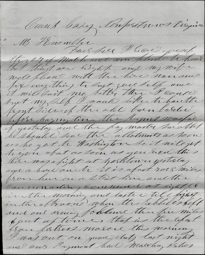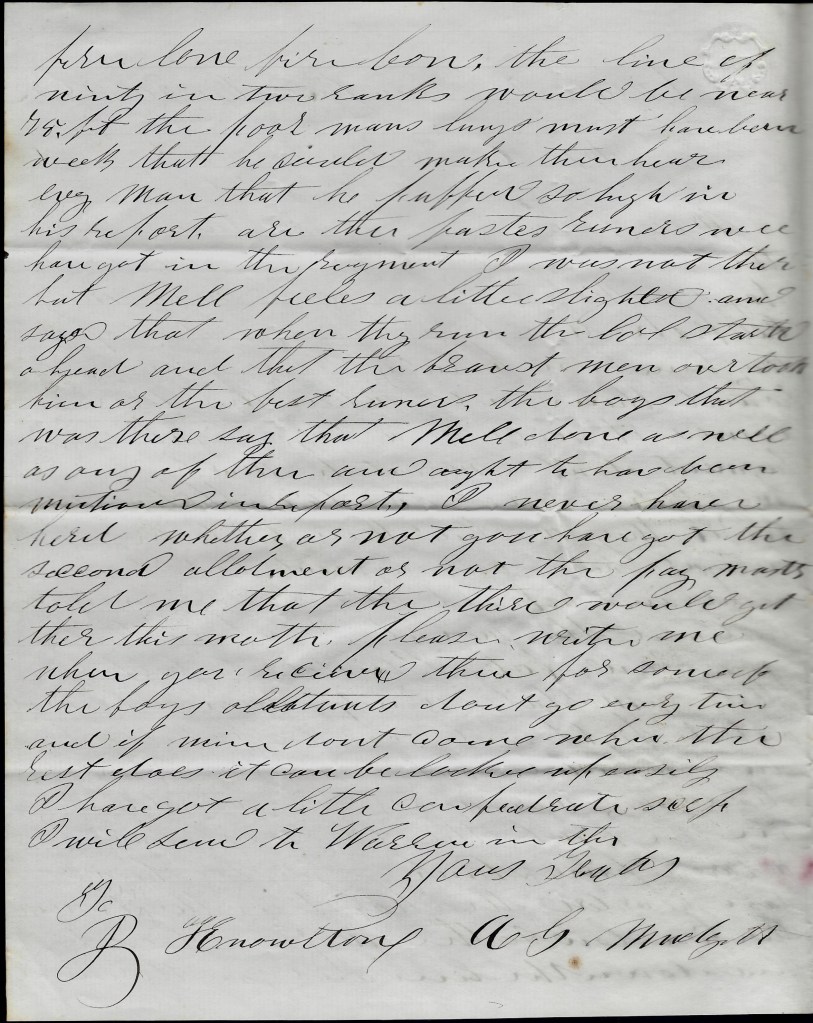 Also transcribed and posted with this letter is one written by Horace’s father directly to Surgeon Nathan F. Blunt. See Letter 2. We learn from that letter that Rev. Mills had another son die of disease in January 1863 which no doubt heightened his concern for Horace lest he suffer the same fate. A study of the Mills family tree reveals that the family had yet another son, not mentioned in the letter, named Albion B. Mills (1846-1863) who enlisted in Co. E, 16th Maine Infantry, in August 1862, and was mortally wounded at the Battle of Gettysburg.