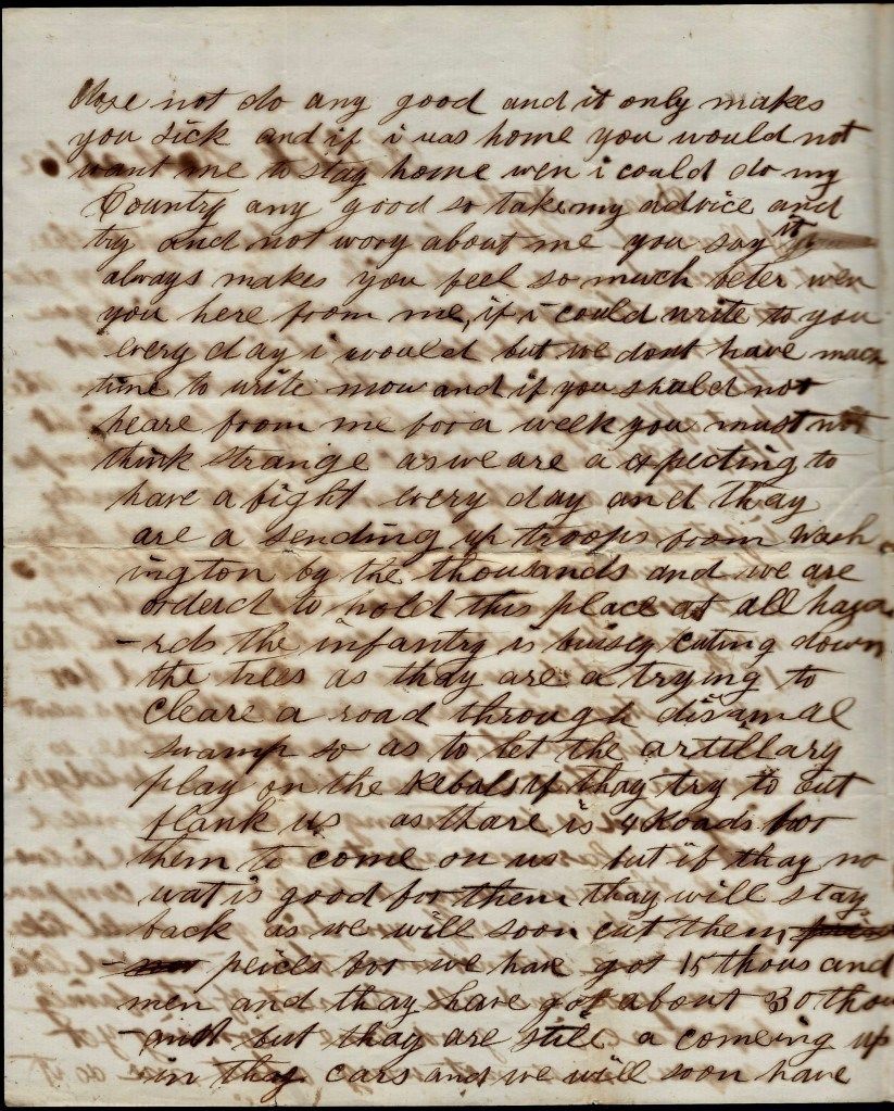 You said you would like to see me but not more than I would like to see you and all the rest of the family but there is a good time a coming yet so you must not worry about me. It would not do any good and it only makes you sick. And if I was home, you would not want me to stay home when I could do my country any good so take my advice and try and not worry about me. You say it always makes you feel so much better when you. hear from me. If I could write to you every day I would, but we don’t have much time to write now and if you should not hear from me for a week, you must not think strange as we are expecting to have a fight every day and they are a sending up troops from Washington by the thousands and we are ordered to hold the place at all hazards.