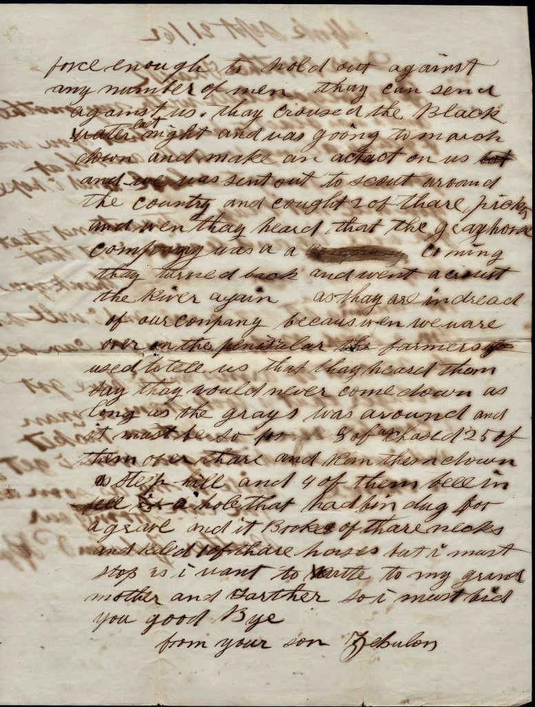 Zeb’s letter was written from Suffolk, Virginia, in September 1862. He informs his mother that they were preparing for an attack at any time by a force with superior numbers but boasts that their Gray Horse Company—Company I—was dreaded so much by the Confederates that he didn’t think they’d come.