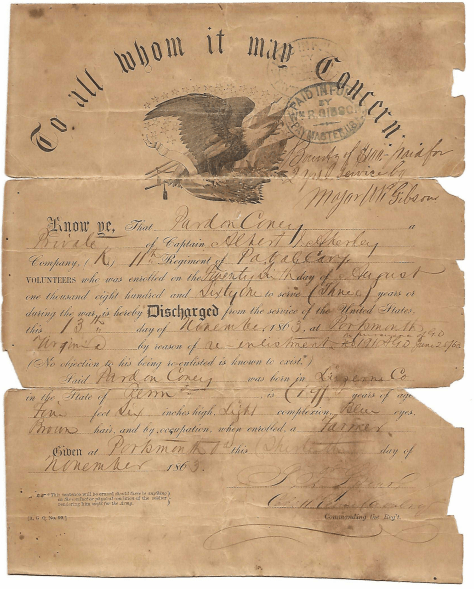 The following letter was written by Pardon Edgar Covey (1843-1896), the son of Almeron Covey (1813-1903) and Mary Ann Sisco (1817-1896) of Abington, Luzerne county, Pennsylvania. Pardon enlisted in Co. K of the 11th Pennsylvania Cavalry (108th Volunteers)—sometimes called “Harlan’s Light Cavalry.” He served from 25 August 1861 to 13 November 1863 according to his discharge papers, though the company muster rolls say he served until 1865.