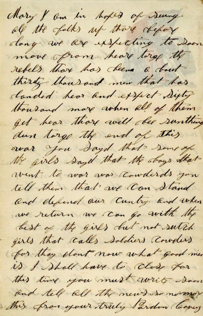 You said that some of the girls said that the boys that went to war was cowards. You tell them that we can stand and defend our country and when we return we can go with the best of the girls but not such gurls that calls soldiers cowards for they don’t know what good men is. I shall have to close for this time. You must write soon and tell all the news. So no more. This from yours truly, — Pardon Covey