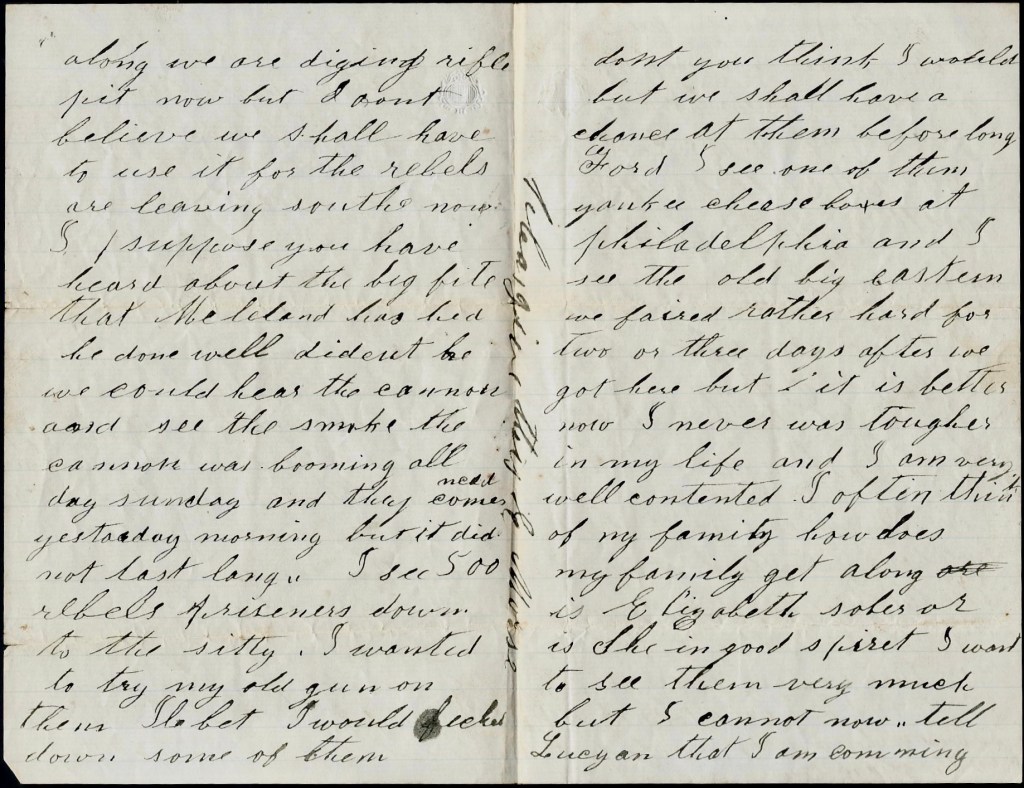 I suppose you want to know how we are getting along. We are digging rifle pits now but I don’t believe we shall have to use it for the rebels are leaving south now. I suppose you have heard about the big fight that McClellan has had. He done well, didn’t he. We could hear the cannon and see the smoke. The cannon was booming all day Sunday and they commenced yesterday morning but it did not last long. I see 500 rebel prisoners down to the city. I wanted to try my old gun on them. I’ll bet I would [have] fetched down some of them, don’t you think I would. But we shall have a chance at them before long.