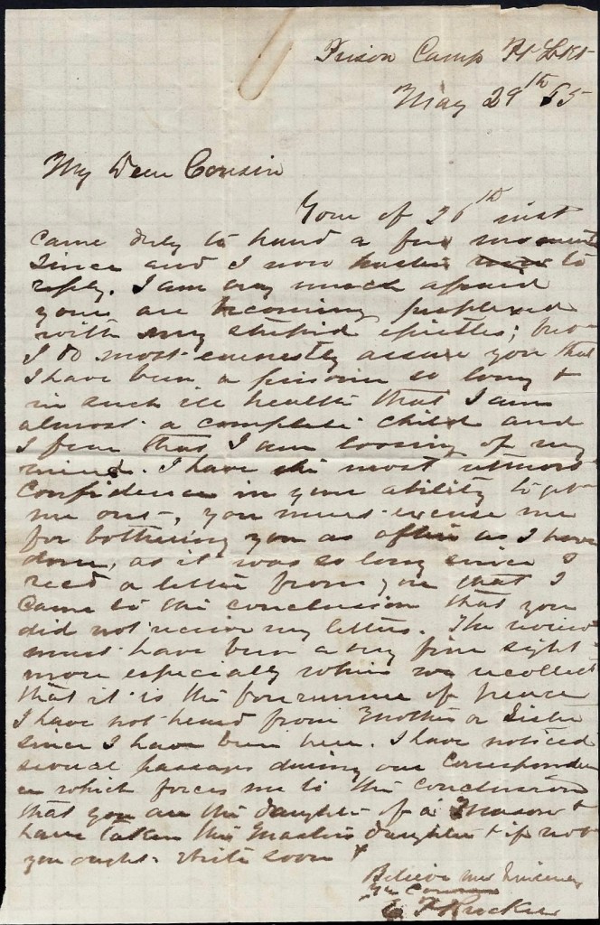 Though the author refers to her as his “cousin,” I don’t believe they were actually related. Several other Confederate prisoners also corresponded with Ms. Miller and called her cousin which may have been a means to better assure delivery and justify aid rendered by the Miller family.