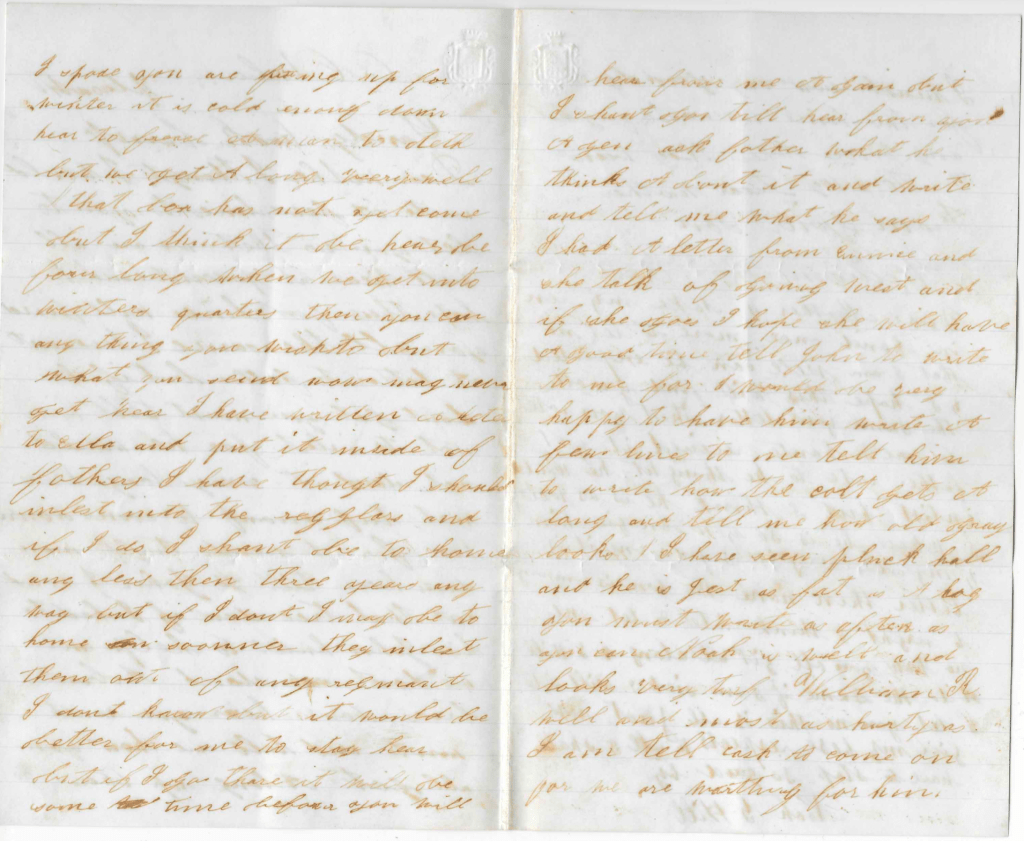 As I said before, the roads continued to be in good condition until Tuesday night. We encamped half a mile south of Dumfries. Soon after we halted for the night, it commenced to rain and rained all night. All we had to shelter us was our little shelter tents which we always carry with us. Even the officers did not fare any too well, but better than they did the next night. Well, in the morning we were marched off in the mud and rain, for one night’s rain makes it very muddy here. It did not rain much in the afternoon. We marched four or five miles when they found the train so far in the rear that we were obliged to halt for the night. But the roads were so bad that the train could not get up with us until the day at noon. Consequently we were obliged to go without supper and breakfast and the officers had to take their chances on the ground with the rest of us, their baggage being with the wagons. And so it kept on raining nights for three days. But, however, we managed to get through the mud somehow and arrived at our present camp which is situated half a mile north of the Court House. In the whole, it was a very hard march for both man and Jackass. Several mules and horses were left dead on the road.