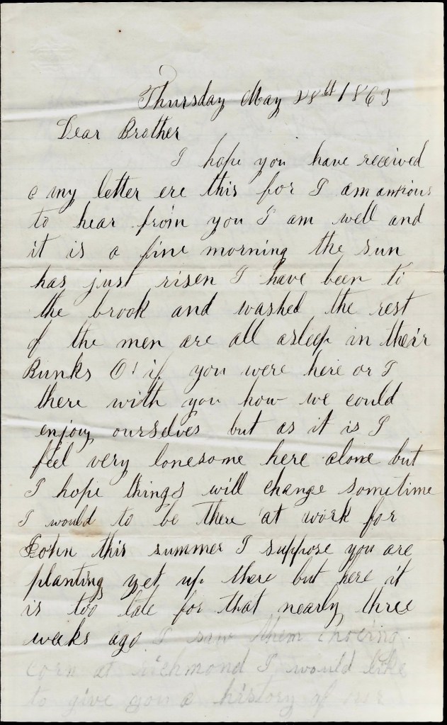 We left Fairfax on the 19th of January which was Monday. The roads were then in fine condition and [made] splendid marching. We arrived at Dumfries Tuesday night—a small village which looks as if it may have seen better days before the war. But like all the villages in Virginia, it shows too plainly the effects of the war on individual property as well as national. Most of them have but one street left, building blackened with smoke, some burned, some torn down, others without any roof, &c. But I will not attempt to describe it with pen and ink. It is too tedious for me. But I had began to give you a description of the march.