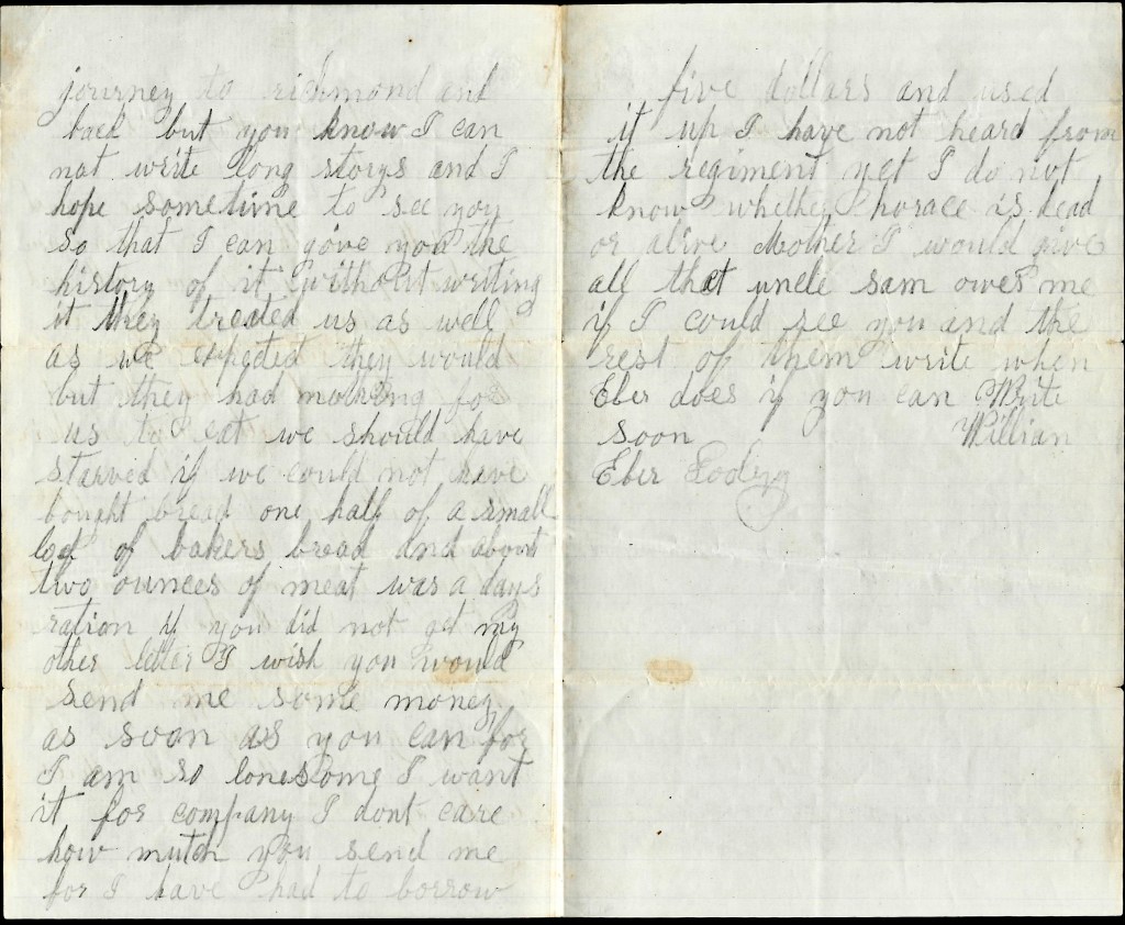 Eber, I wish you would send me some stamps. I thought I wrote to you for some in my last letter but I must have forgotten it as you did not send them. I had my picture taken twice for you and once for mother. I do not know which one would suit her the best. I think of sending them by Asa Fish. He is going to start home tomorrow. If he carries them, you will find them at the office. Yours truly, — William