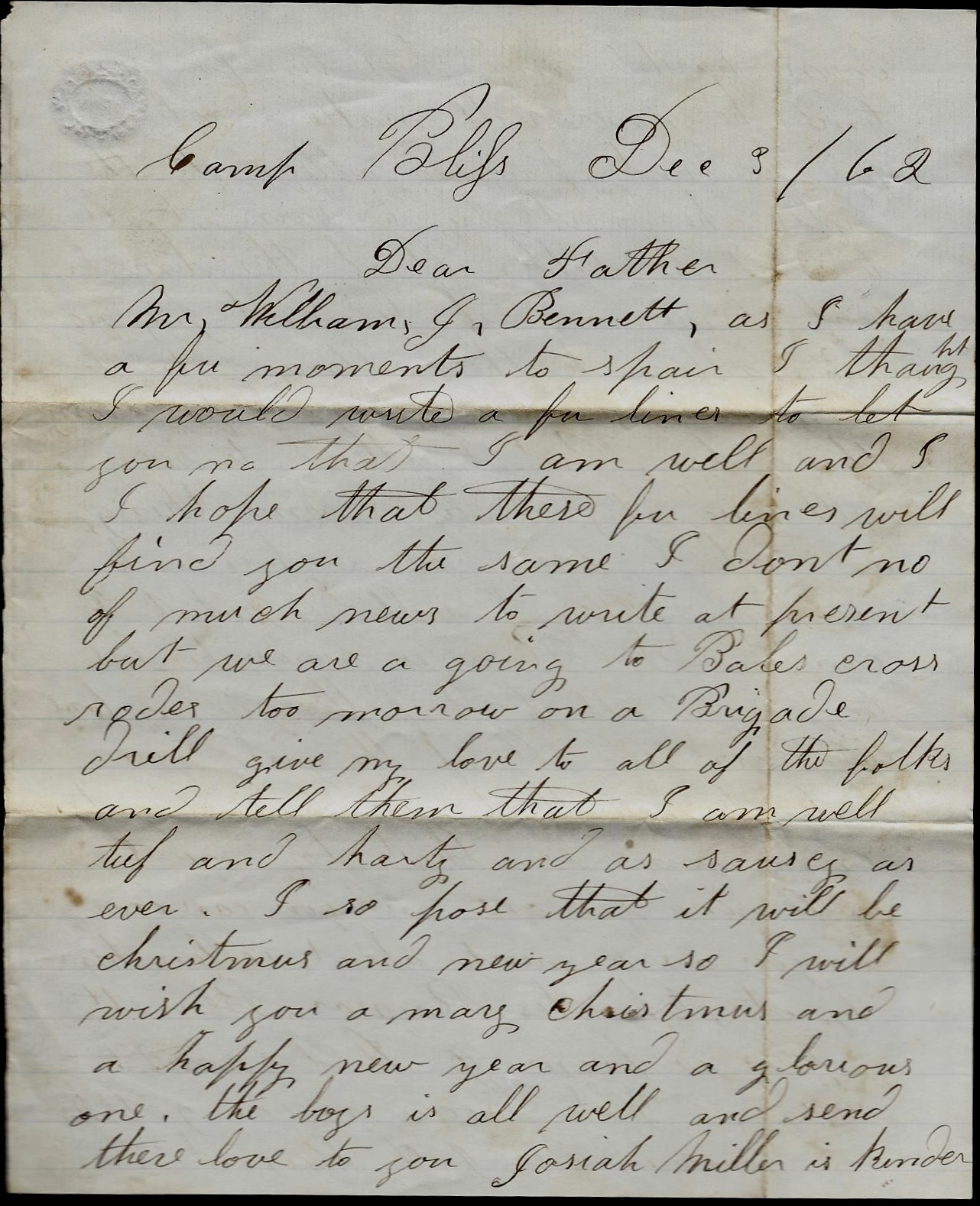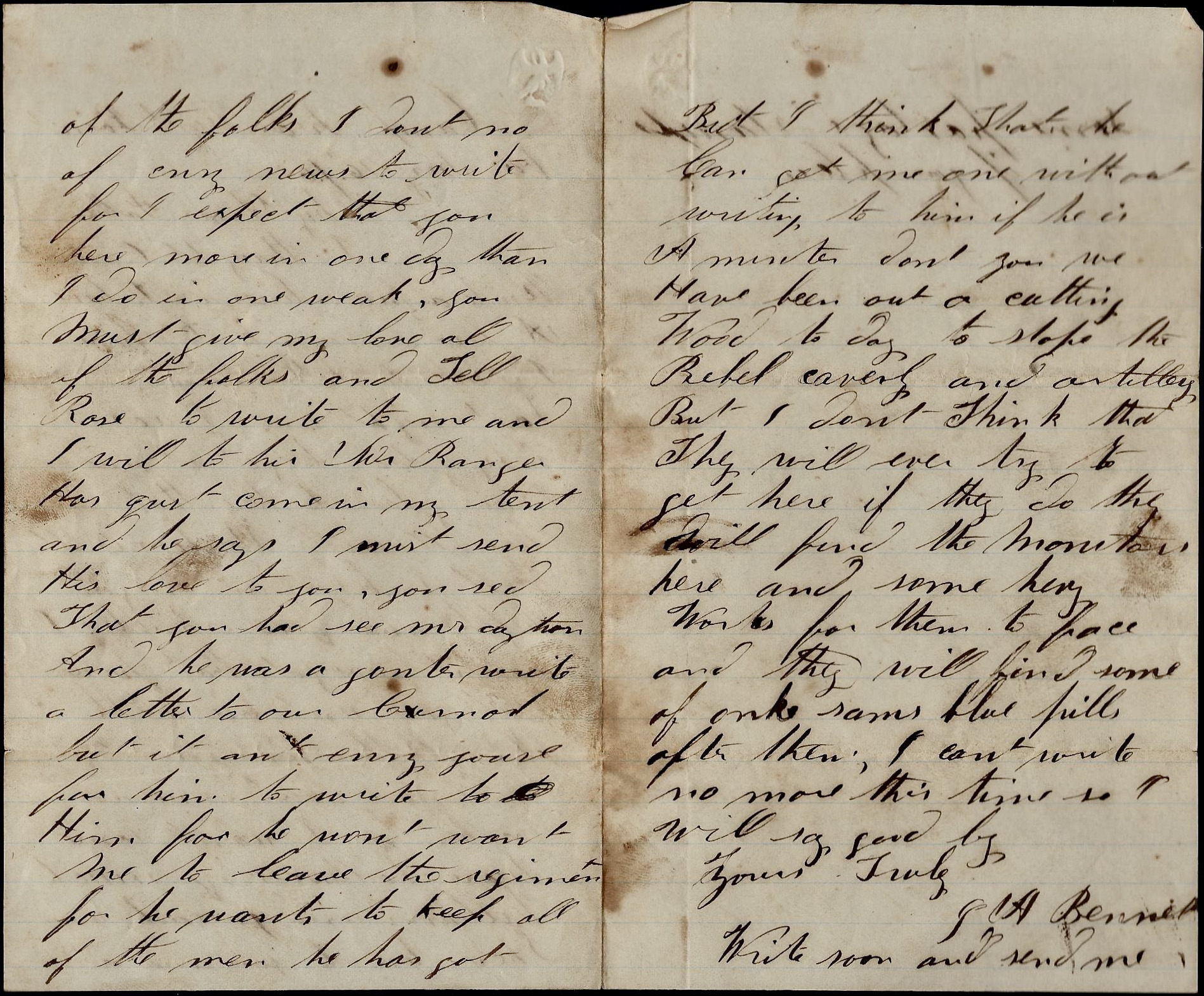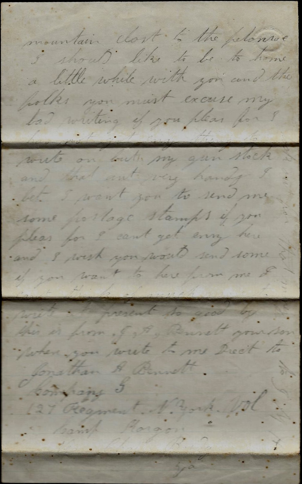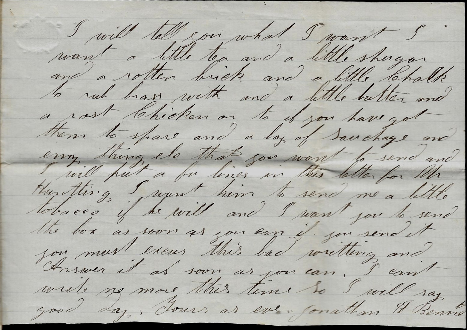 Bill Miller sends his love to you and all the rest. He says that he wants the war to end so he can get something to eat besides wormy hard tack. We have had poor hard bread. We can’t lay a cake down and leave it. If we do, it will run away. I want you to send me a half a quire of writing paper and some envelopes and a pocket knife. I don’t know of anything more this time. Josiah is well and sends his love to all. Give my love to Captain Miller and the family and tell them once in awhile. Give my love to Anna and all the rest. And tell them that Jamey is well and sends his love to them. I don’t know of anything new to write this time. I hope the next time that I write, I can tell you that Charleston is taken and the war ended. You must write every chance and not wait for we can’t send letters every day from here [even] if we had time to write them. I can’t write any more now. Be sure and write soon and believe me as ever your son, — Jonathan A. Bennett