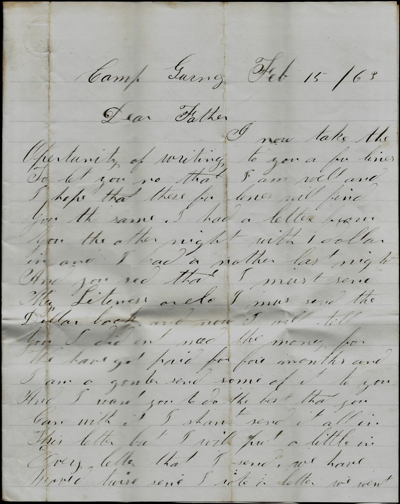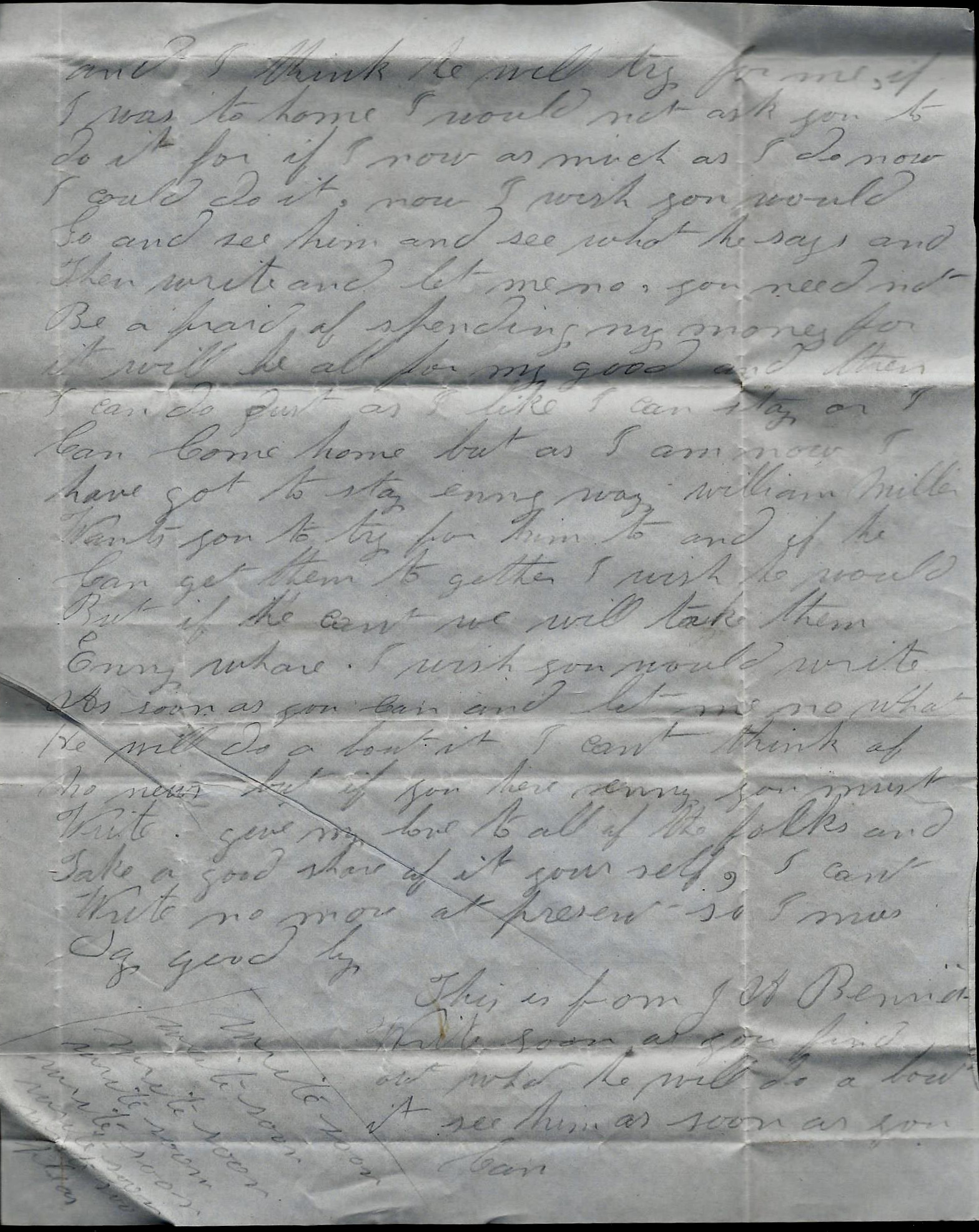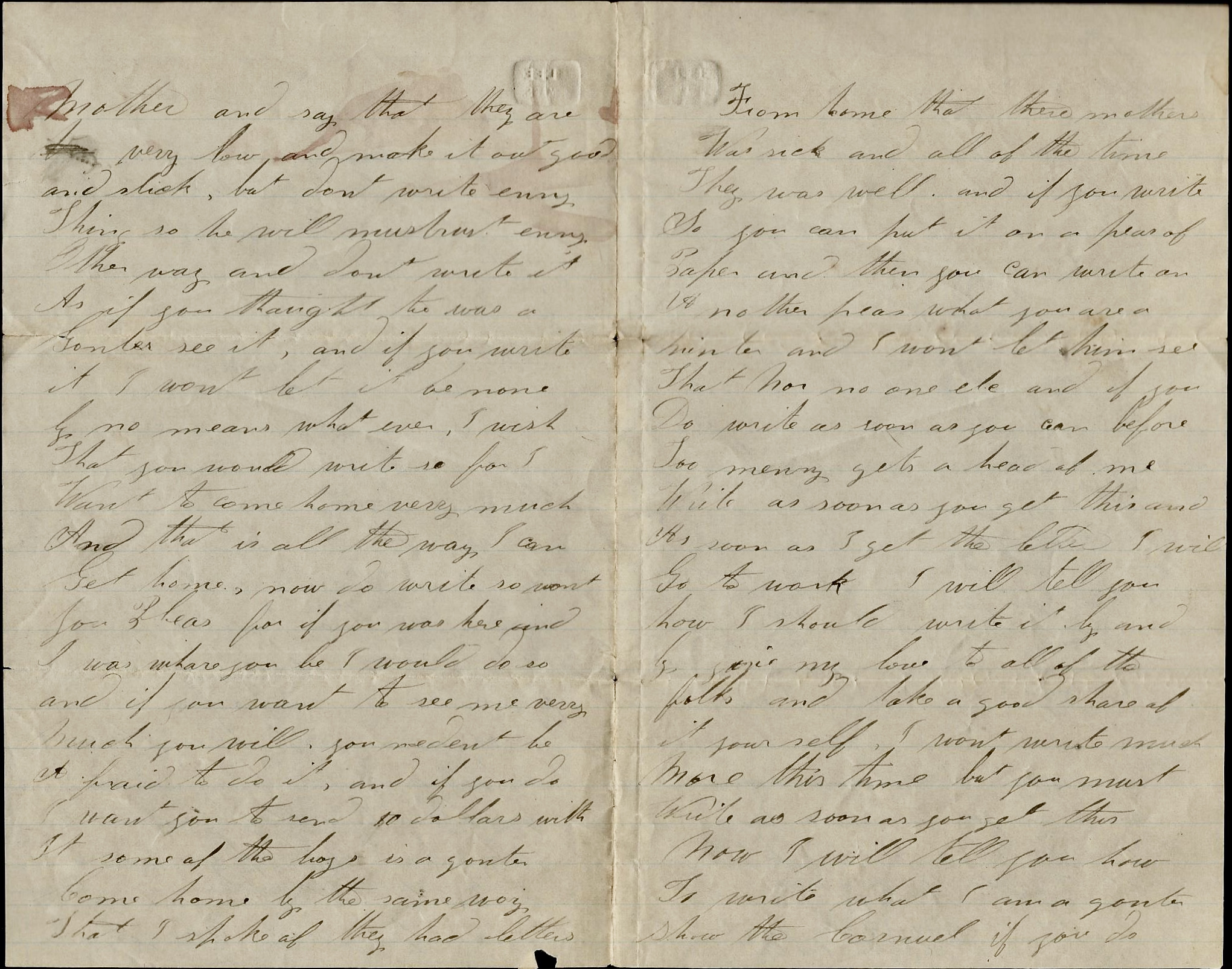 And if you write it, I won’t let it be known by no means whatever. I wish that you would write so for I want to come home very much and that is all the way I can get home. Now do write so, won’t you please, for if you was here and I was where you be, I would do so. And if you want to see me very much, you will. You needn’t be afraid to do it, and if you do, I want you to send $10 dollars with it. Some of the boys is a going to come home by the same way that I spoke of. They had letters from home that their mother was sick and all of the time the was well. And if you write so, you can put it on a piece of paper and then you can write on another piece what you are a mind to and I won’t let him see that nor no one else. And if you do, write as soon as you can before to many gets ahead of me. Write as soon as you get this and as soon as I get the letter, I will go to work.