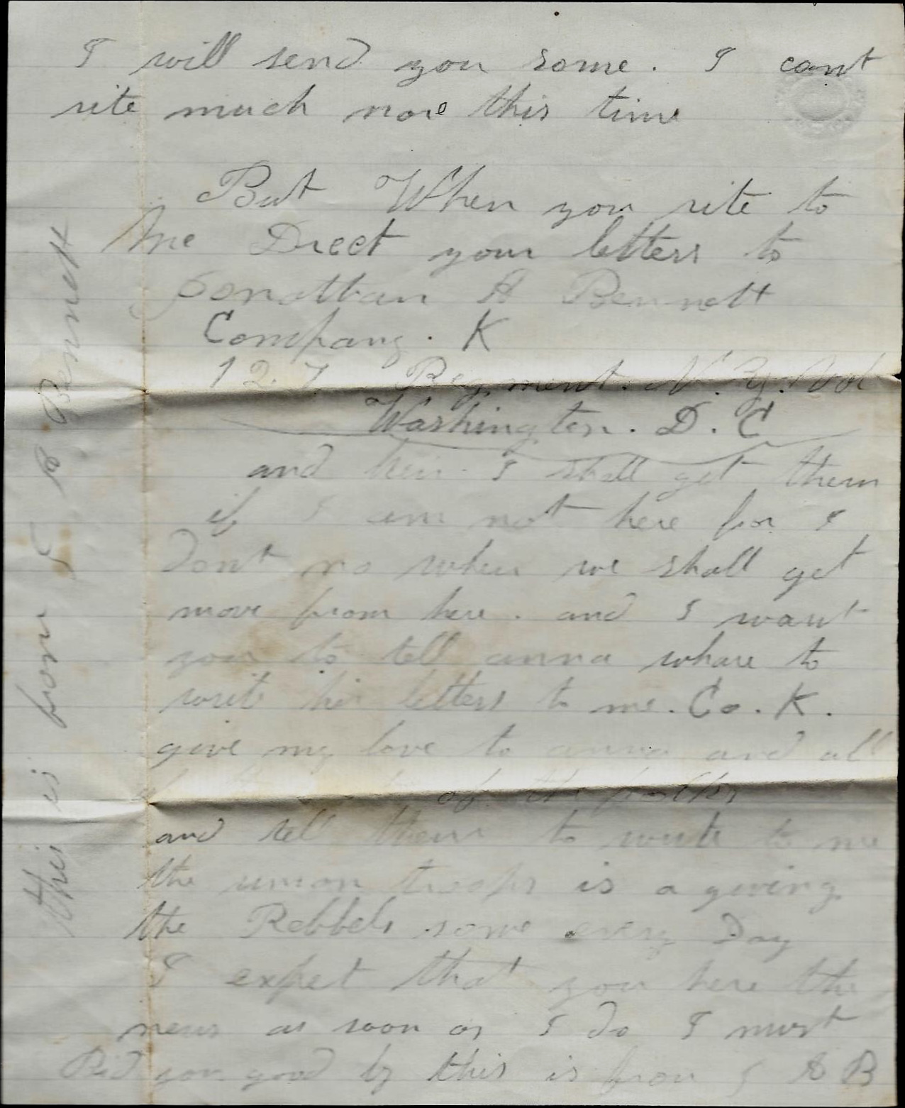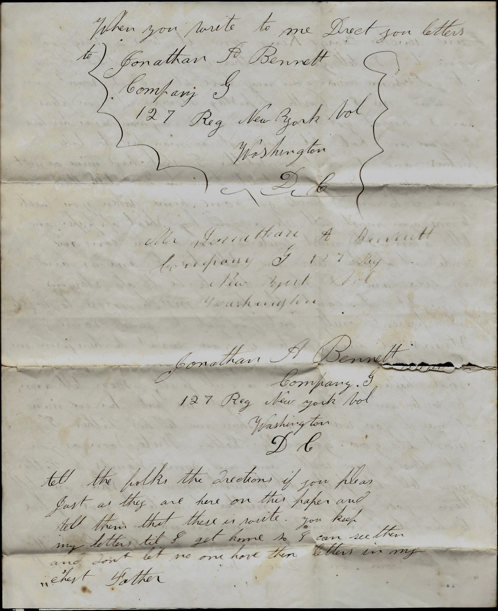 You must give my love to all of the folks and tell them I should be very glad to hear from them once in awhile. Mr. Ranger is well—all but a cold. He has got a bad cold but I guess it won’t hold on long. The boys all seems to be in good health and good cheer and they seem to love the good old flag as well as ever and the Lord knows I do and I hope you do. I expect that you have heard all about what is going on here. I can’t write no more this time. So goodbye. write soon. Yours truly, — Jonathan A. Bennett, Co. K, 127th Regt.
