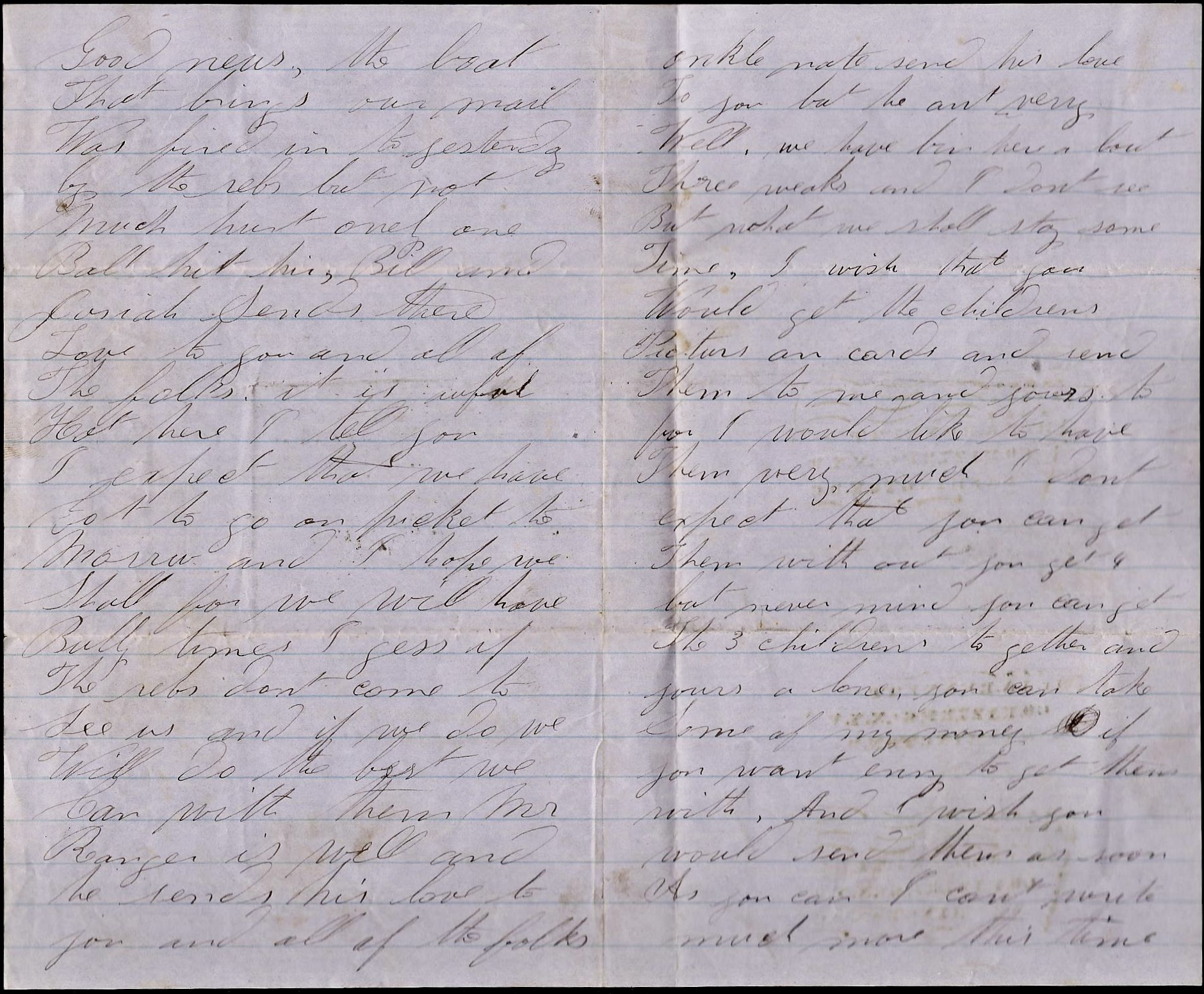 The other night some of our boys got a calf somewhere and they had a big time with him. And he went first rate, I tell you/ we have some good times and some hard times. we are in the Rebel land and I hope that we shall have a chance to have a brush with them. Bill says that he has just got contented to stay here now. He ain’t had a letter from home in 4 weeks and he says that he begins to think that they don’t care anything about him. He is as happy as they make them in our days. you must excuse bad writing and write when you can and write all the news.