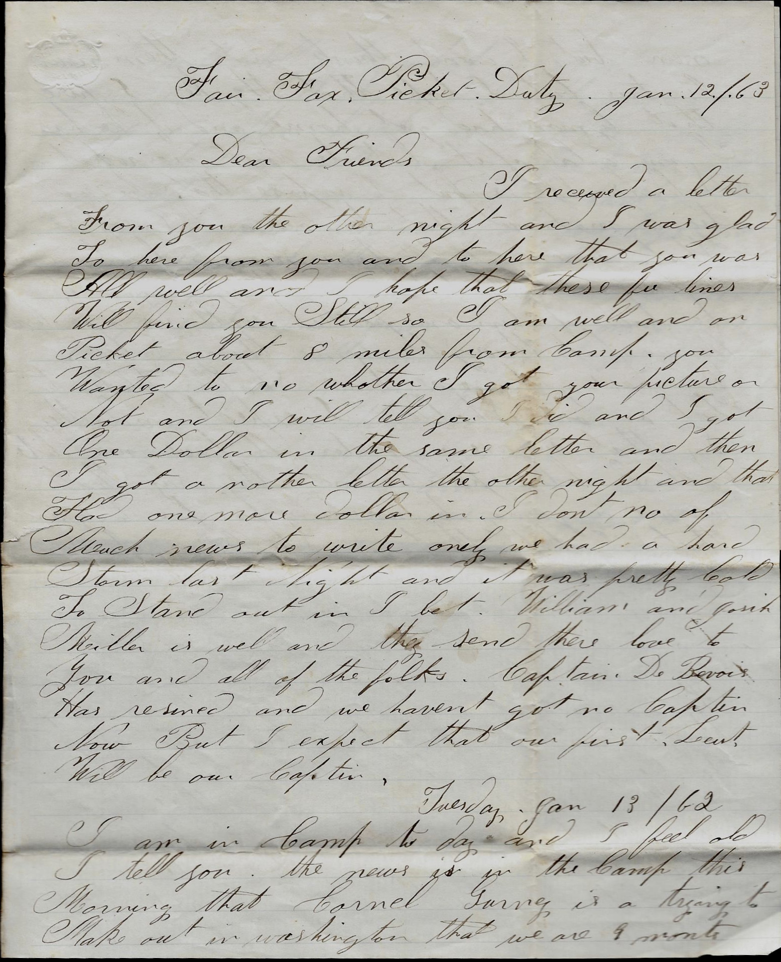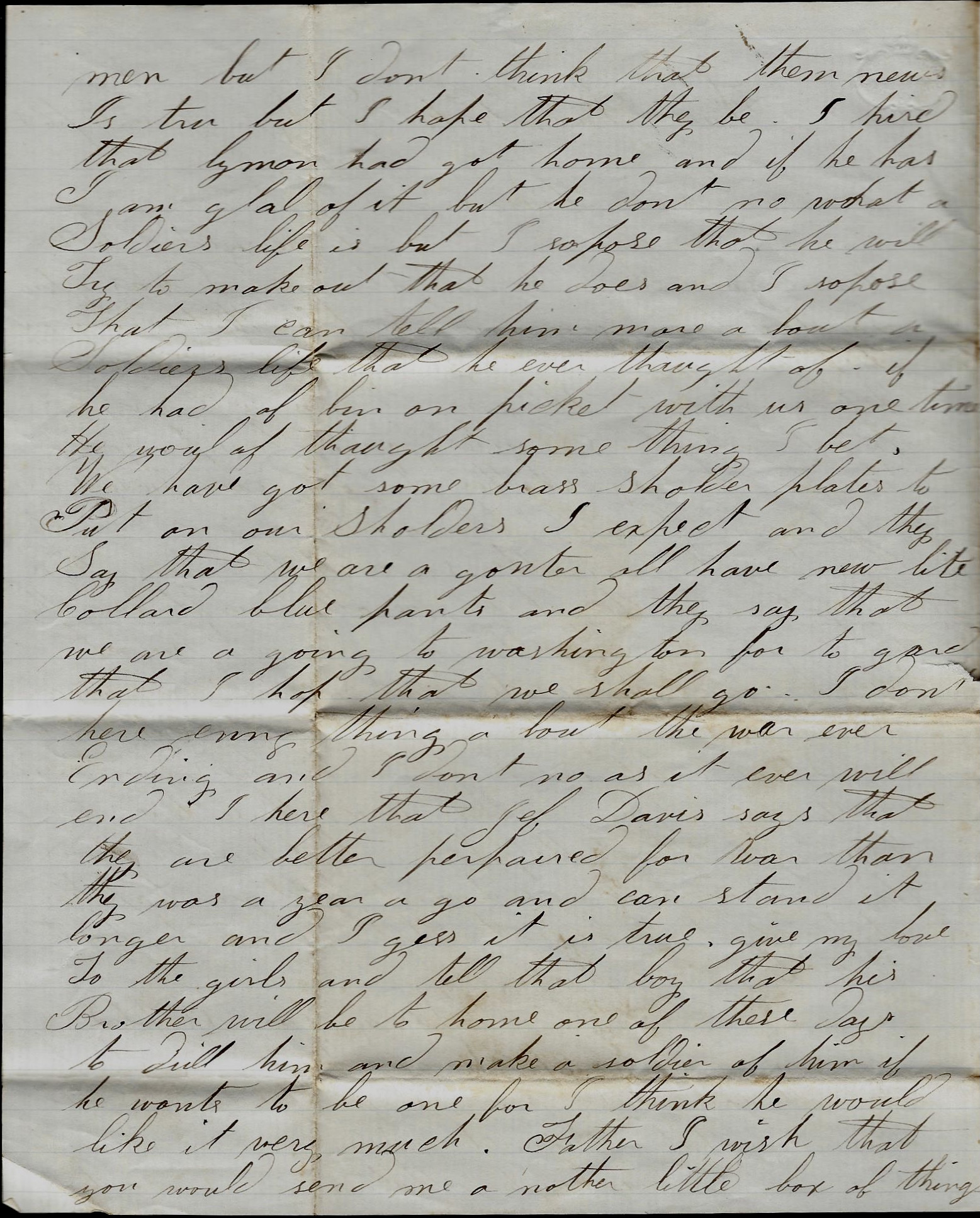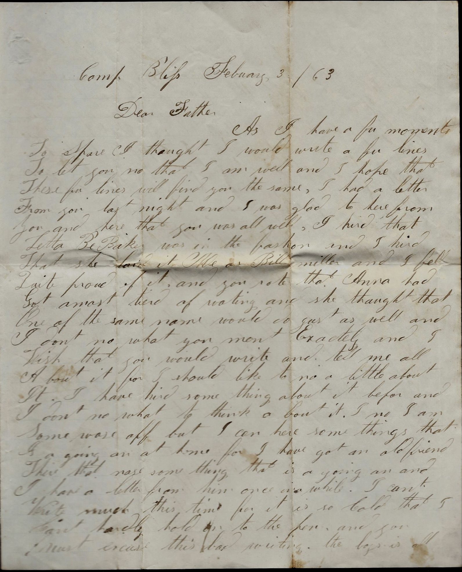 I don’t know of much news but you must write as often as you can and I will do the same. I don’t have much time but I will write as often as I can. Bill and Josiah [Miller] has gone on picket tonight. You must write and tell me what Charles Dayton says and if he gets it. You can send it to me and I will do the best I can with it. I hope you won’t be ashamed about me for I ain’t at all afraid. Tell the folks to write when they can and I will do the same.