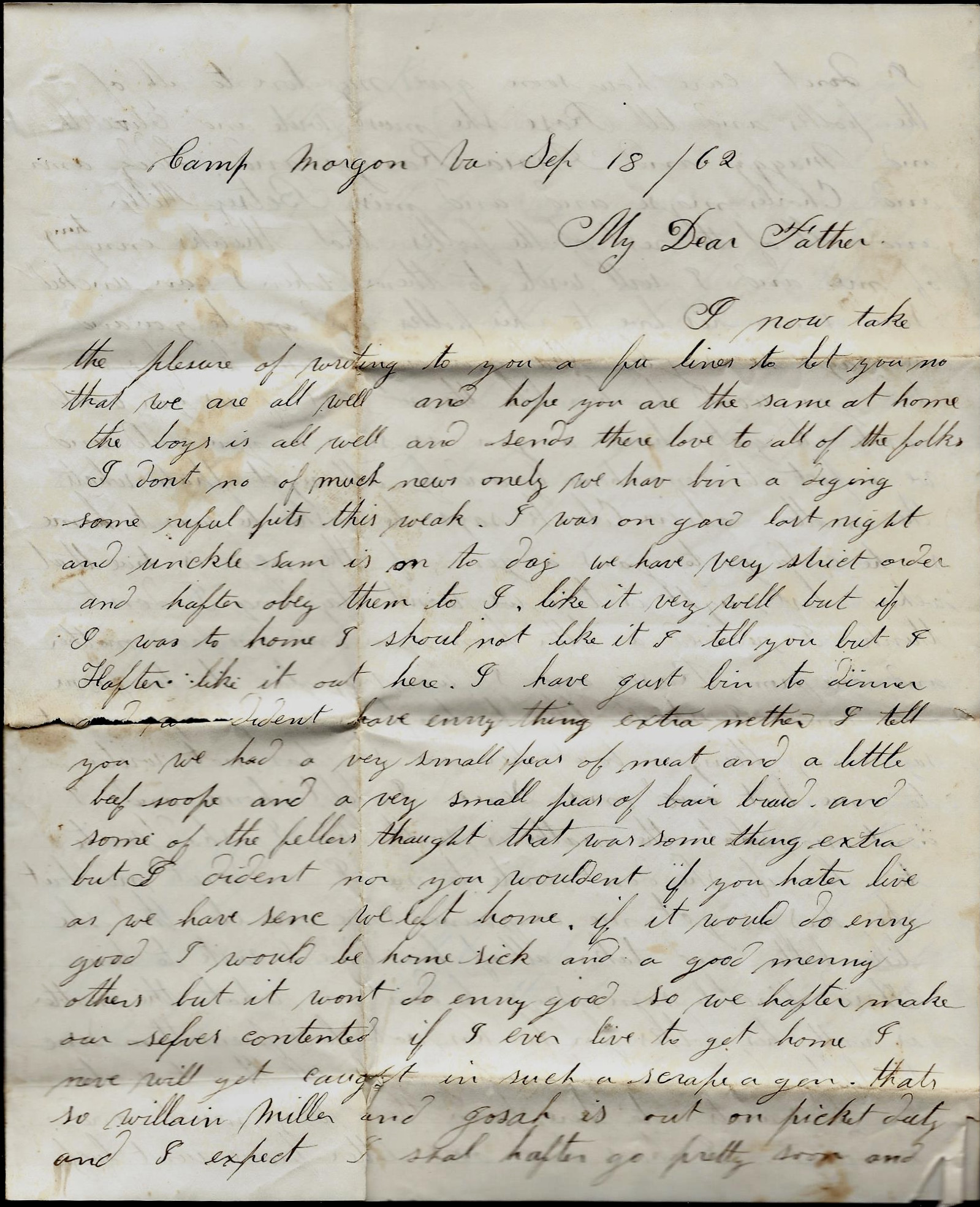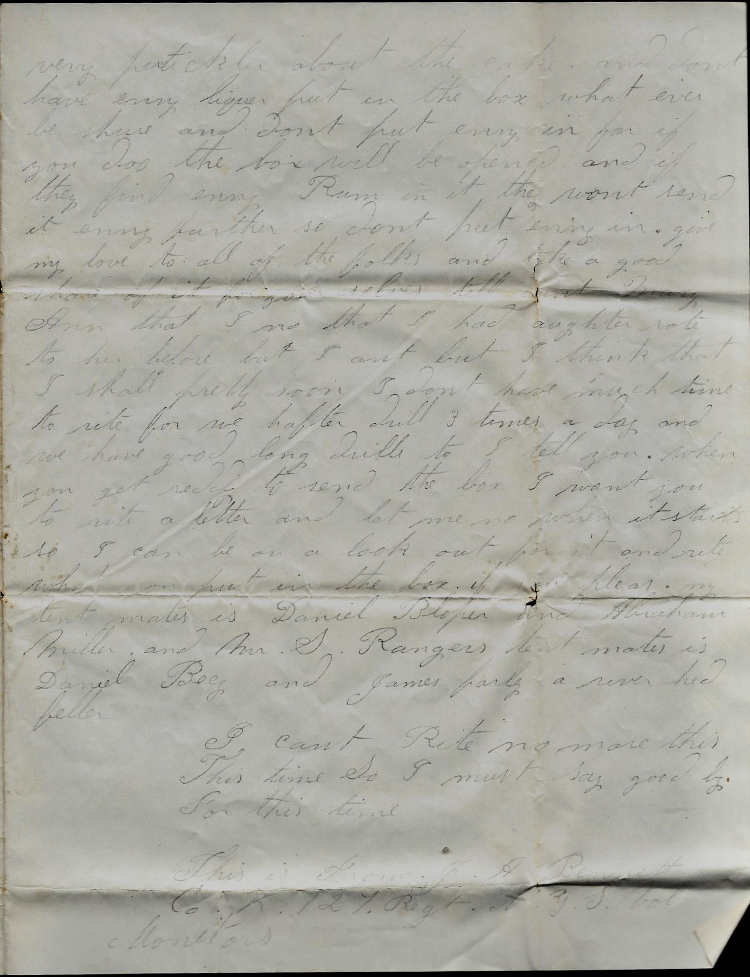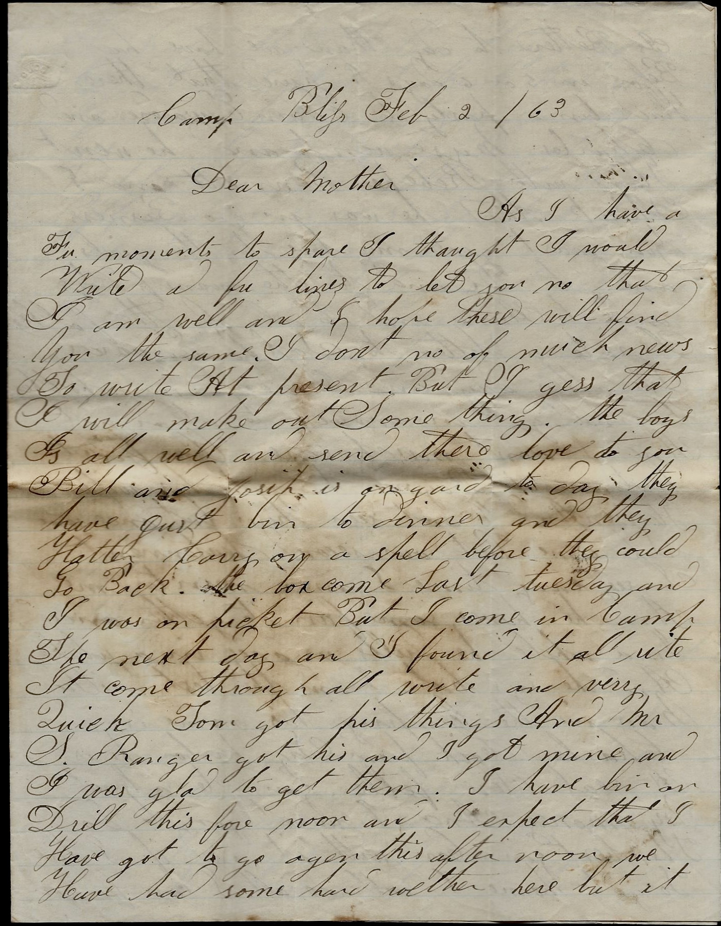 I don’t know of much news but you must write as often as you can and I will do the same. I don’t have much time but I will write as often as I can. Bill and Josiah [Miller] has gone on picket tonight. You must write and tell me what Charles Dayton says and if he gets it. You can send it to me and I will do the best I can with it. I hope you won’t be ashamed about me for I ain’t at all afraid. Tell the folks to write when they can and I will do the same.