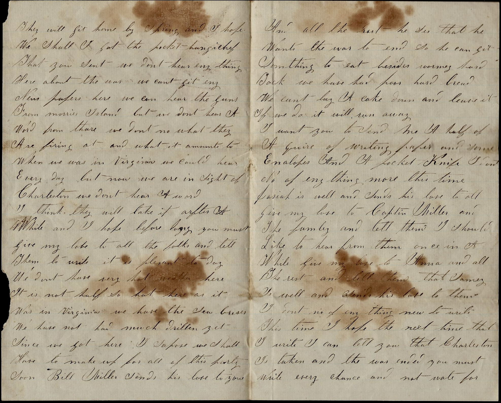 I got the pocket handkerchief that you sent. We don’t hear anything here about the war. We can’t get ay newspapers here. We can hear the guns from Morris Island but we don’t hear a word from there. We don’t know what they are firing at and what it amounts to. When we was in Virginia we could hear everyday, but now we are in sight f Charleston, we don’t hear a word. I think they will take it after awhile and I hope before long.