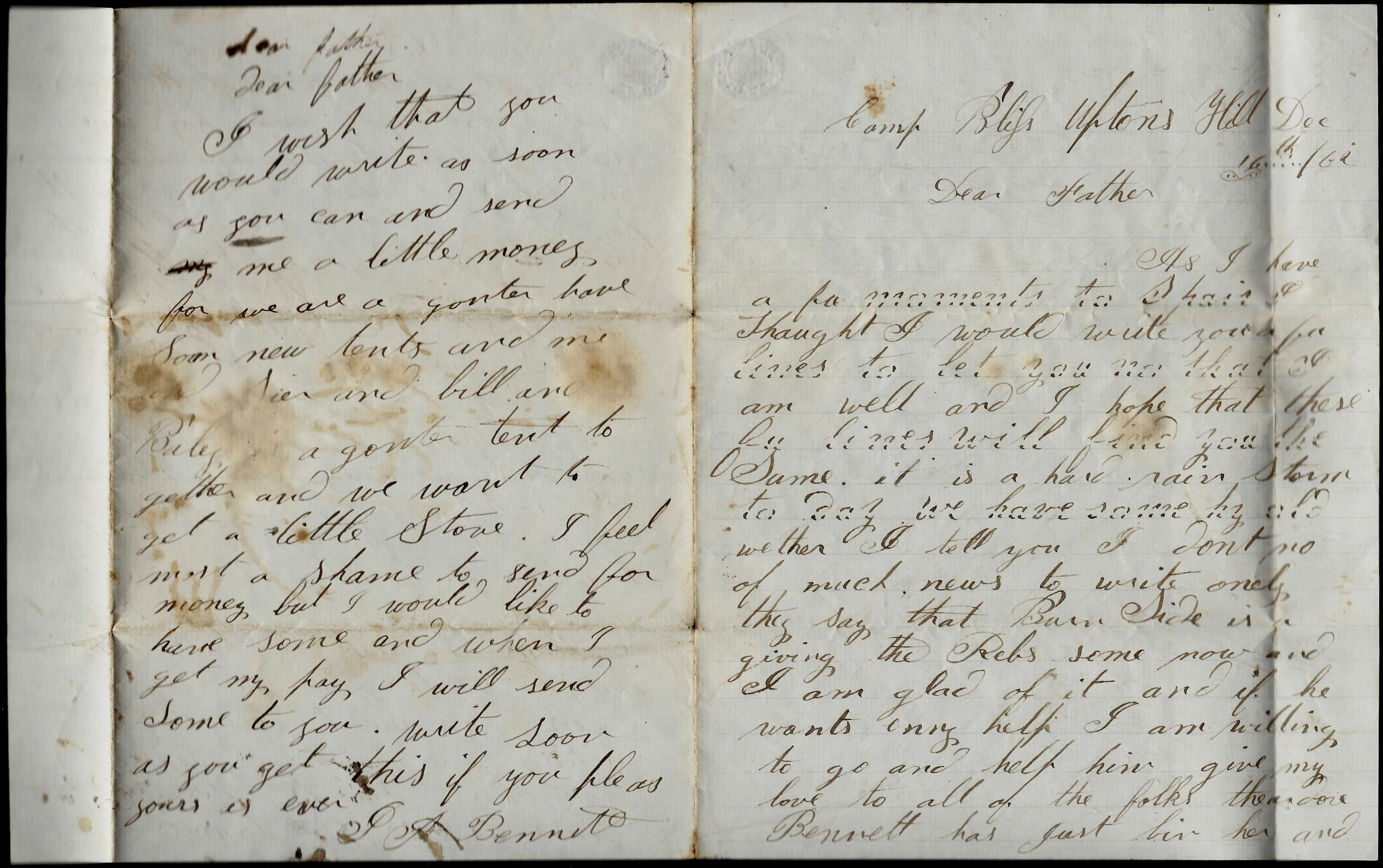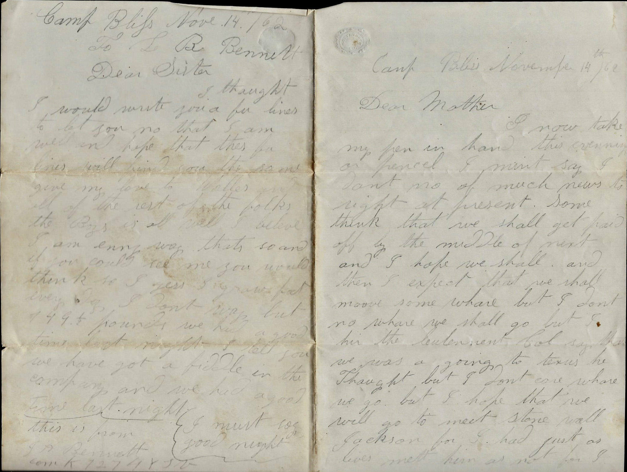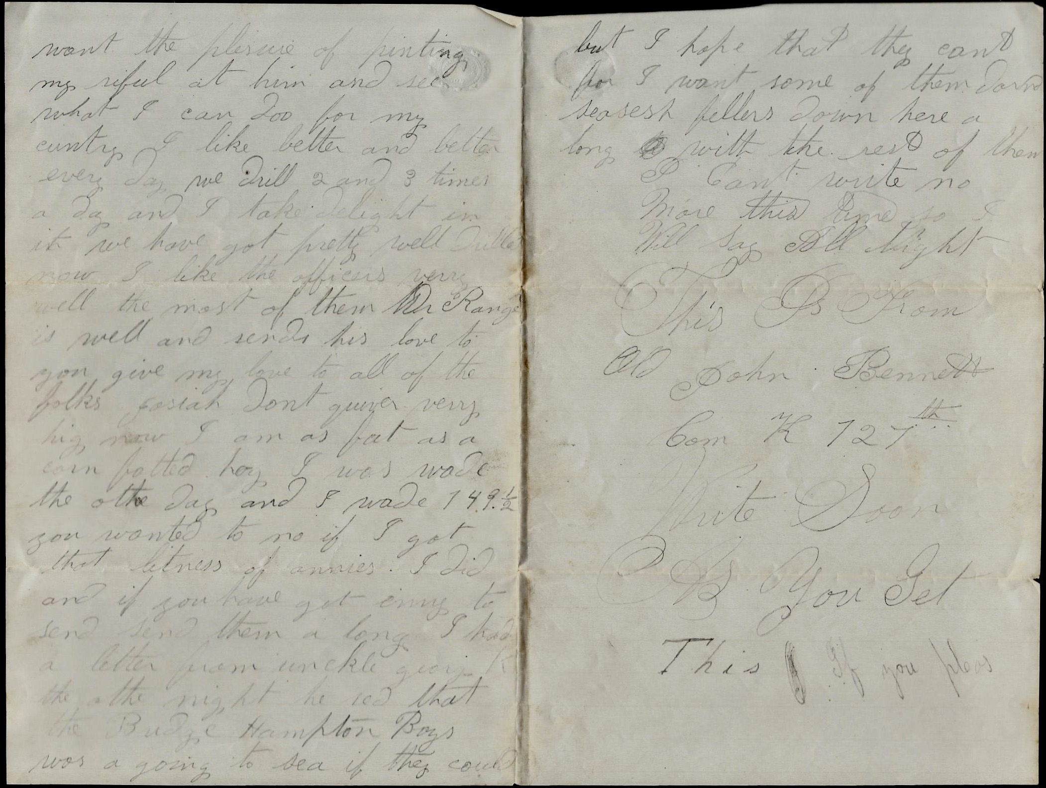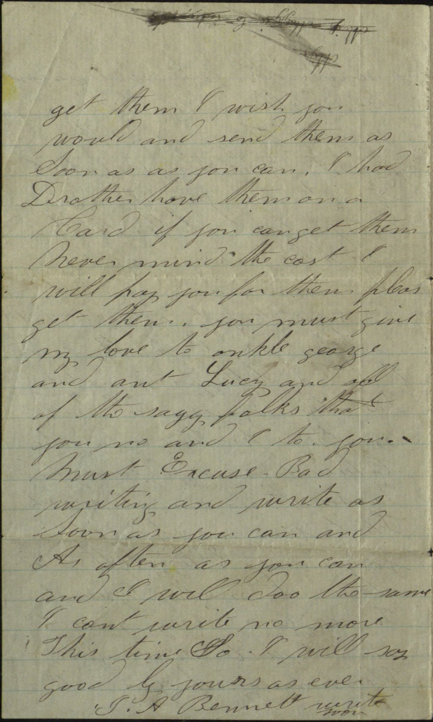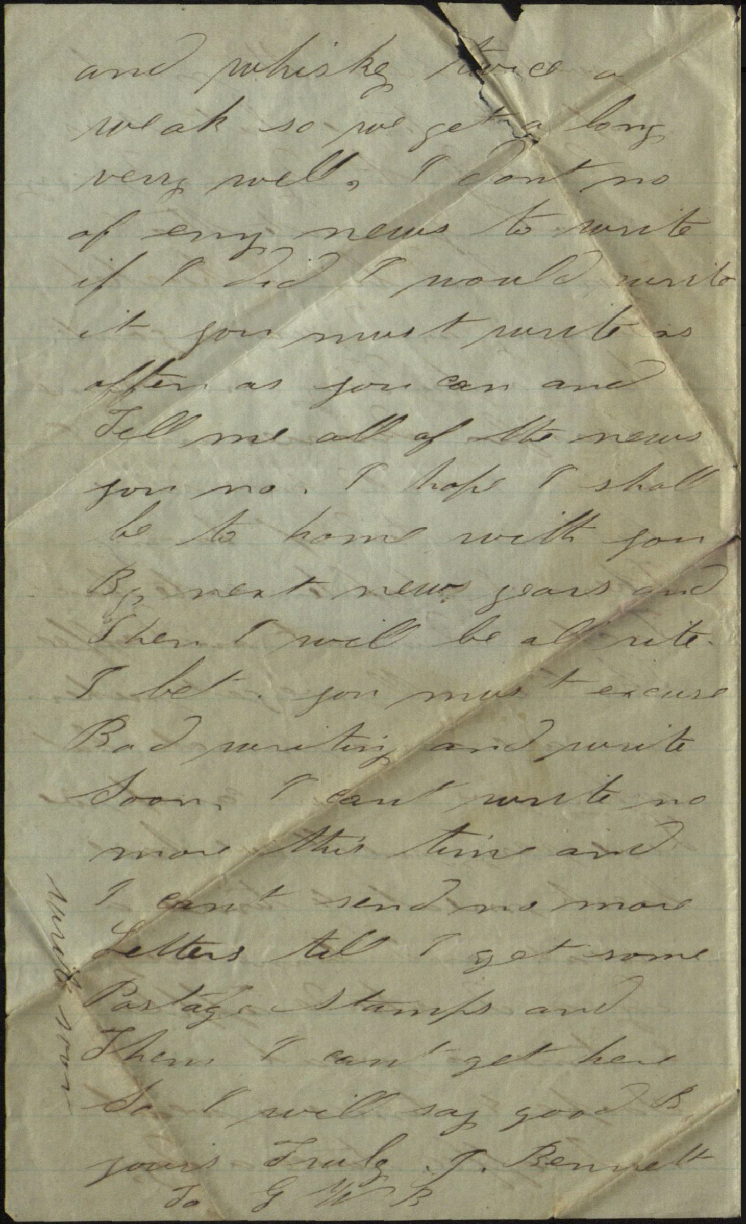 I don’t know of any news to write. If I did, I would write it. You must write as soon as you can and tell me all of the news. I hope I shall be at home with you by next New Years and then I will be all right, I bet. You must excuse bad writing and write soon. I can’t write no more this time and I can’t send no more letters till I get some postage stamps and them I can’t get here so I will say goodbye. Yours truly, — J. Bennett