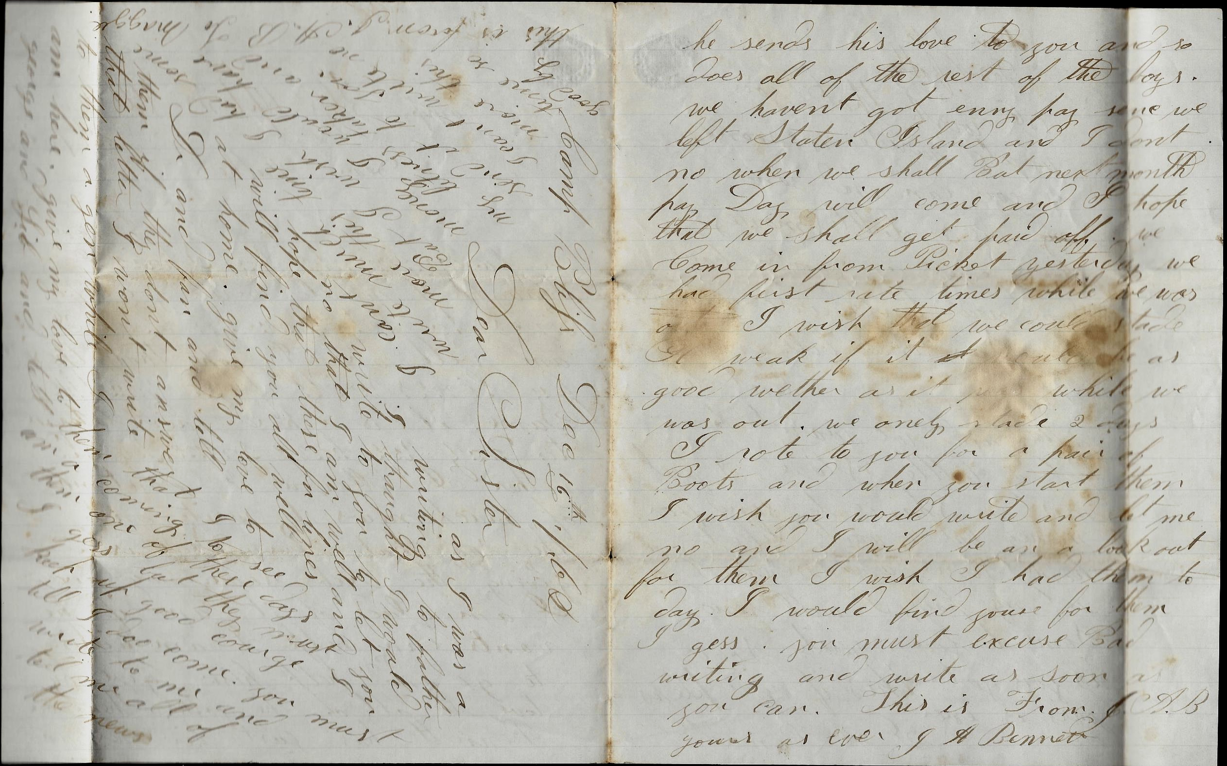 I have got a few moments to spare once more so I thought I would write a few lines to let you know that I have not forgot you. Now I will tell you what I wish you would so with my money if you can. I wish you would go and see Charles P. Dayton and ask him if he will try to get me a commission and take my money to pay for it. I don’t expect that he will do it for nothing and I don’t want him to. You know he got one for Dave Shary and I guess he will for me. I don’t care ig it takes all I have got for if I can get a Lieutenant’s berth, I can get enough to make it up pretty soon for they get from 80 to 100 dollars a month and if they don’t like it, they can resign and come home. And if you will set him to work, I guess he will get it, I don’t care if he gets it in a nigger regiment, it don’t make no difference to me. I think that he will get it if you pay him well for I guess he likes money well enough and I think he will try for me. If I was to home, I would not ask you to do it for if I know as much as I do now, I could do it. Now I wish you would go and see him and see what he says and then write and let me know. You need not be afraid of spending my money for it will be all for my good and then I can do just as I like, I can stay or I can come home. But as I am now, I have got to stay anyway.