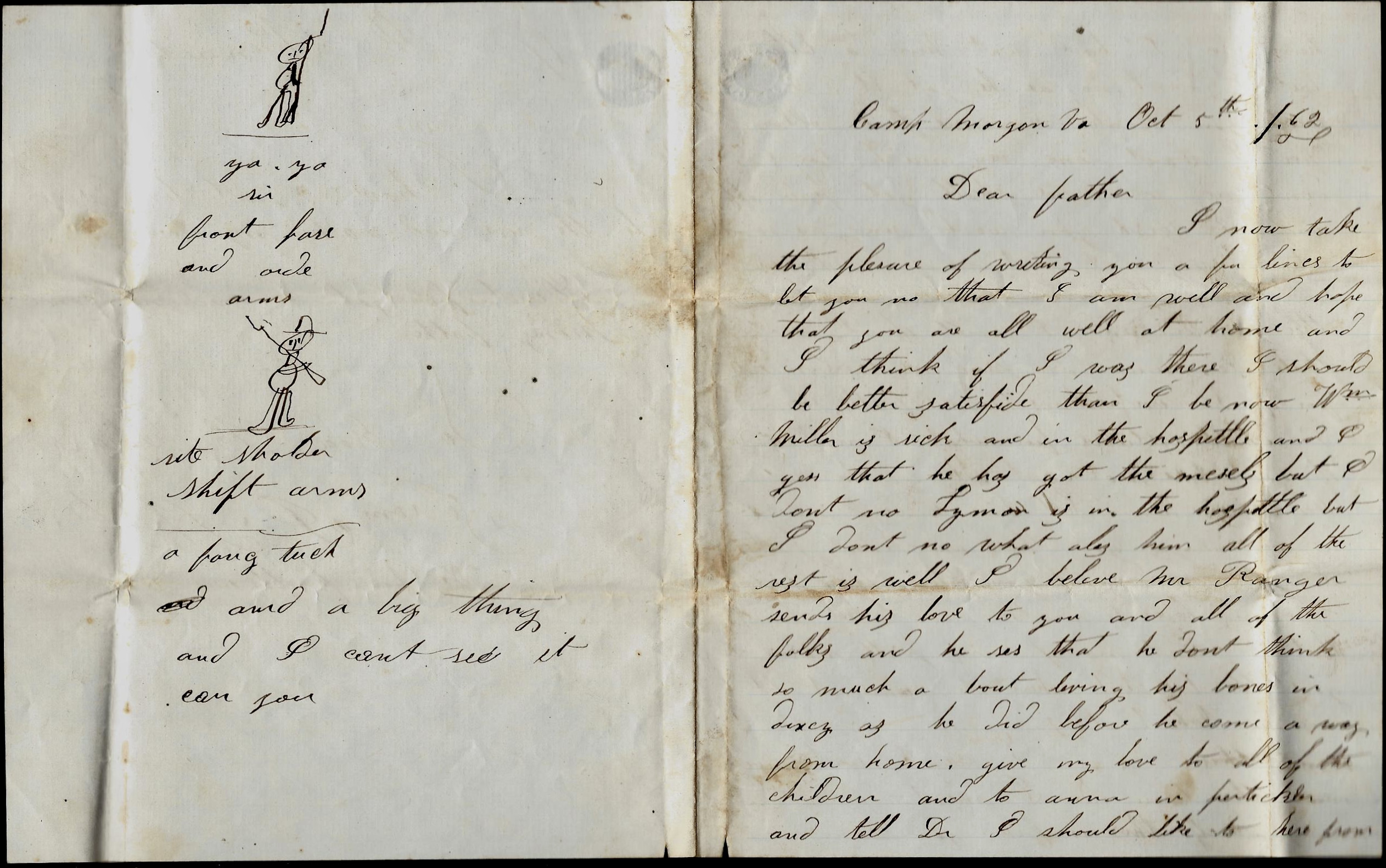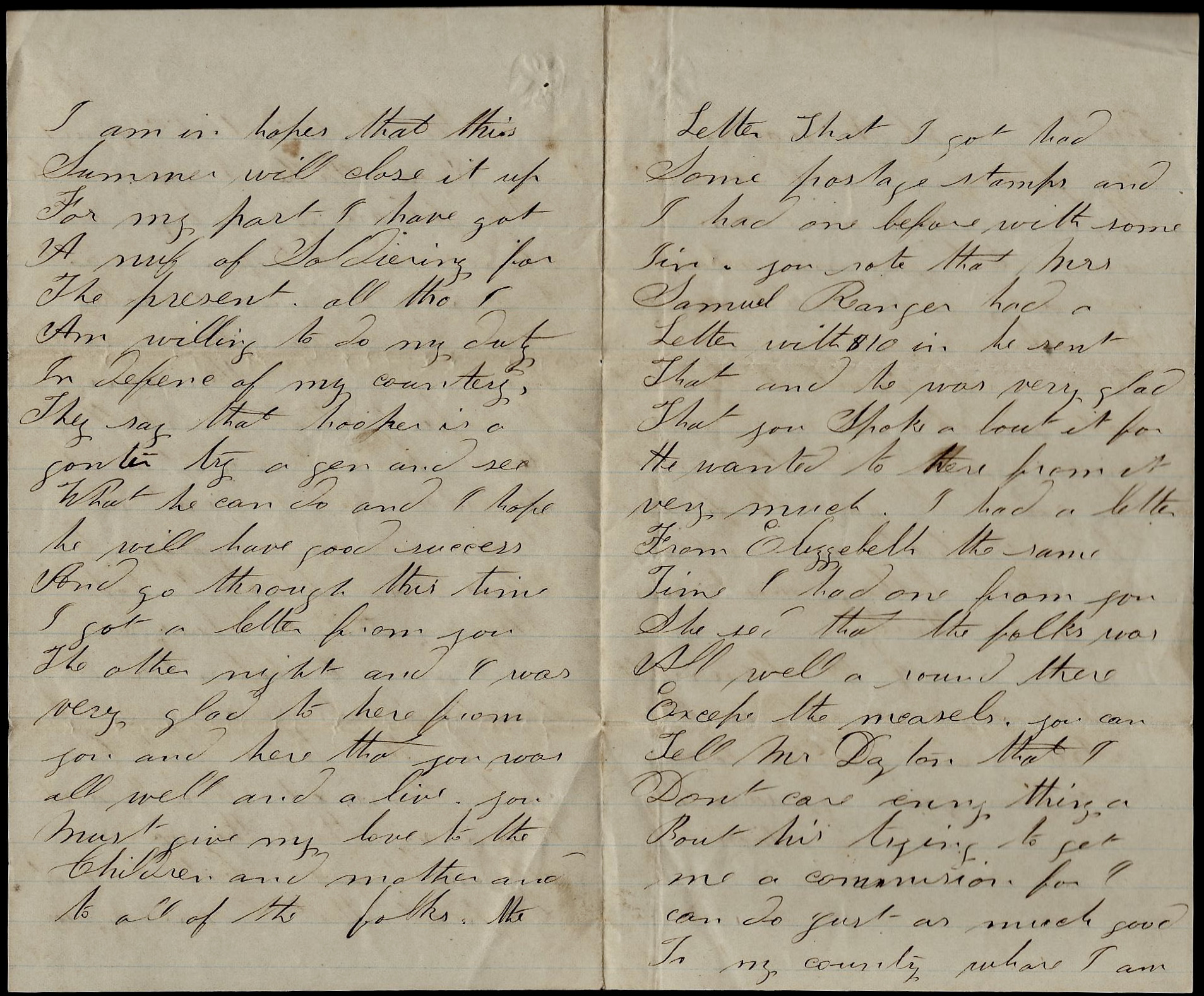 I got a letter from you the other night and I was very glad to hear from you and hear that you was all well and alive. You must give my love to the children and mother and to all of the folks. The letter that I got had some postage stamps and I had one before with some in. You wrote that Mrs. Samuel Ranger had a letter with $10 in. He sent that and he was very glad that you spoke about it for he wanted to hear from home very much. I had a letter from Elizabeth the same time I had one from you. She said that the foks was all well around there except the measles. You can tell Mr. Dayton that I don’t care anything about his trying to get me a commission for I can do just as much good for my country where I am but I wish he was in my place.