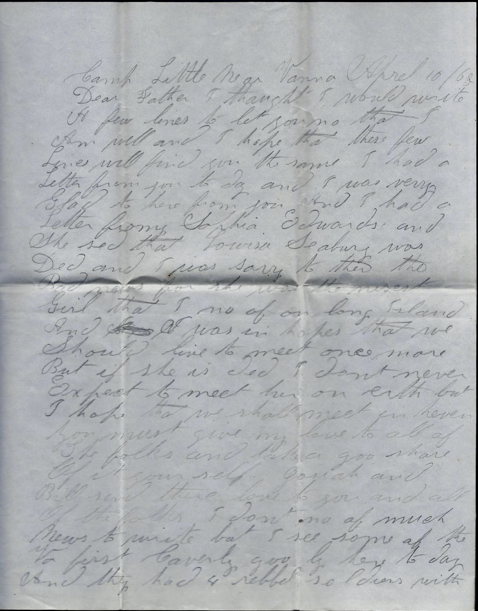 I thought I would write a few lines to let you know that I am well and I hope that these few lines will find you the same. I had a letter from you today and I was very glad to hear from you. And I had a letter from Sophia Edwards and she said that Louisa Seaburg was dead and I was sorry to hear the bad news for she was the nicest girl that I know of on Long Island and I was in hopes that we should live to meet once more, But if she is dead, I don’t never expect to meet her on earth but I hope that we shall meet in heaven. You must give my love to all of the folks and take a good share of it yourself. Josiah and Bill [Miller] send their love to you and all of the folks.