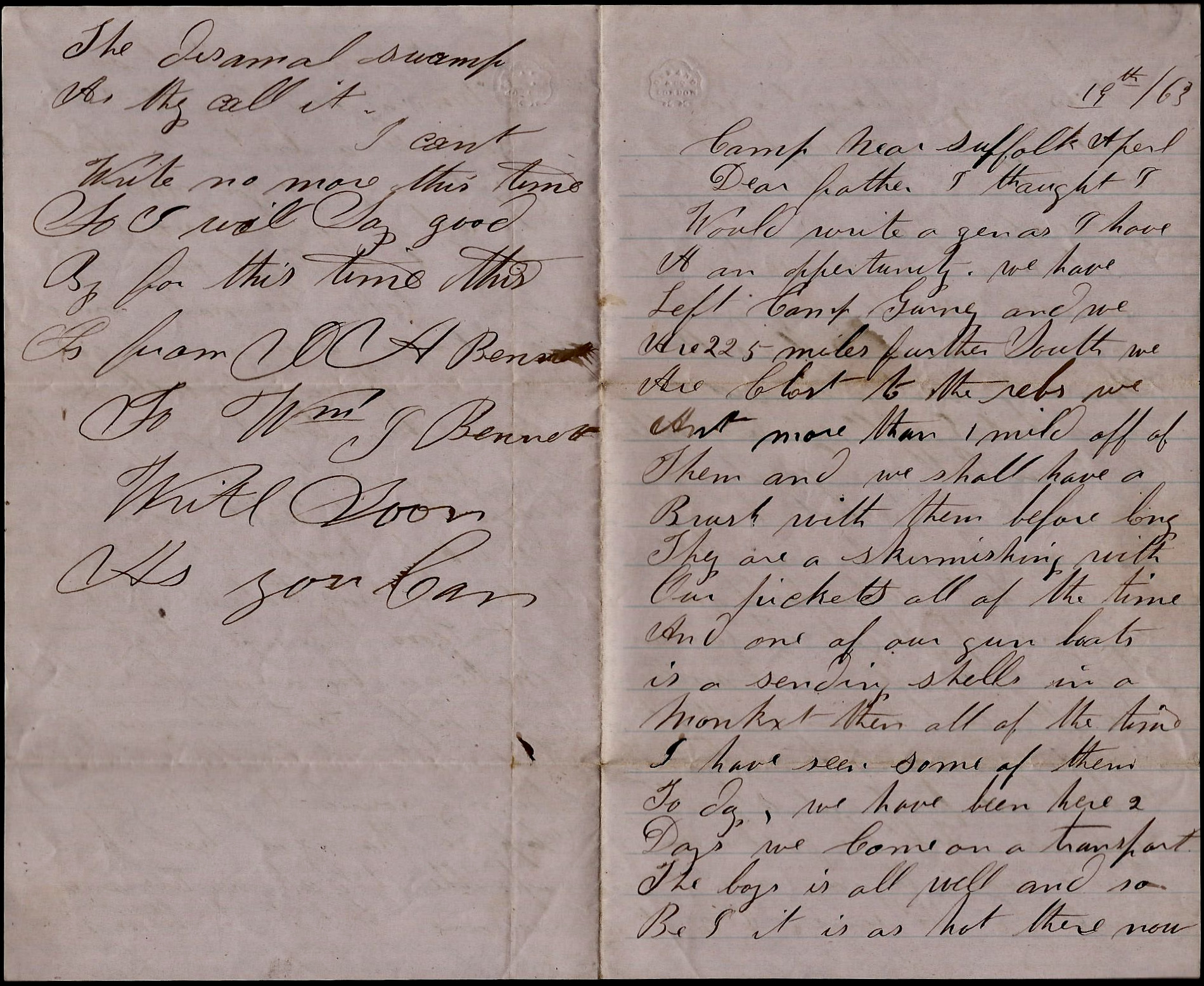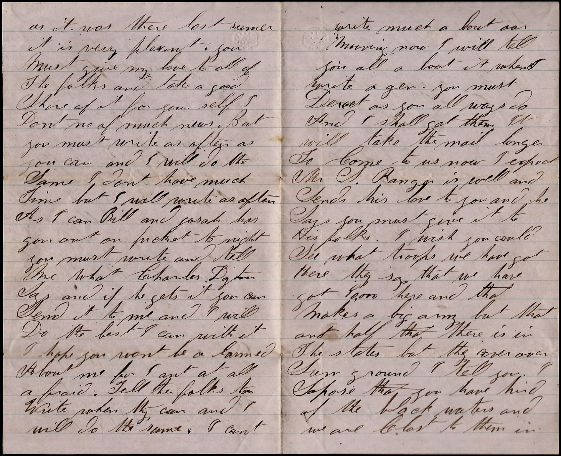 Mr. Samuel Ranger is well and sends his love to you and he says you must give it to his folks. I wish you could see what troops we have got here. They say that we have 90,000 here and that makes a bog army but that ain’t half that there is in the states but they cover over some ground, I tell you. I suppose that you have heard of the Black Water and we are close to them in the Dismal Swamp, as they call it.