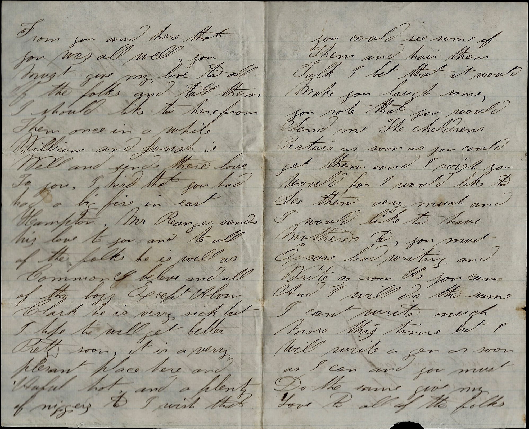 When I wrote before, we was at West Point and now we are at Yorktown. And how long we shall stay, I can’t tell. I had a letter from you Thursday and I was very glad to hear from you and hear that you was all well. You must give my love to all of the folks and tell them I should like to hear from them once in awhile.William and Josiah [Miller] is well and send their love to you. I heard that you had had a big fire in East Hampton. Mr. Ranger sends his love to you and to all of the folks. He is well as common, I believe, and all of the boys except Alvin Clark. He is very sick but I hope he will get better pretty soon.