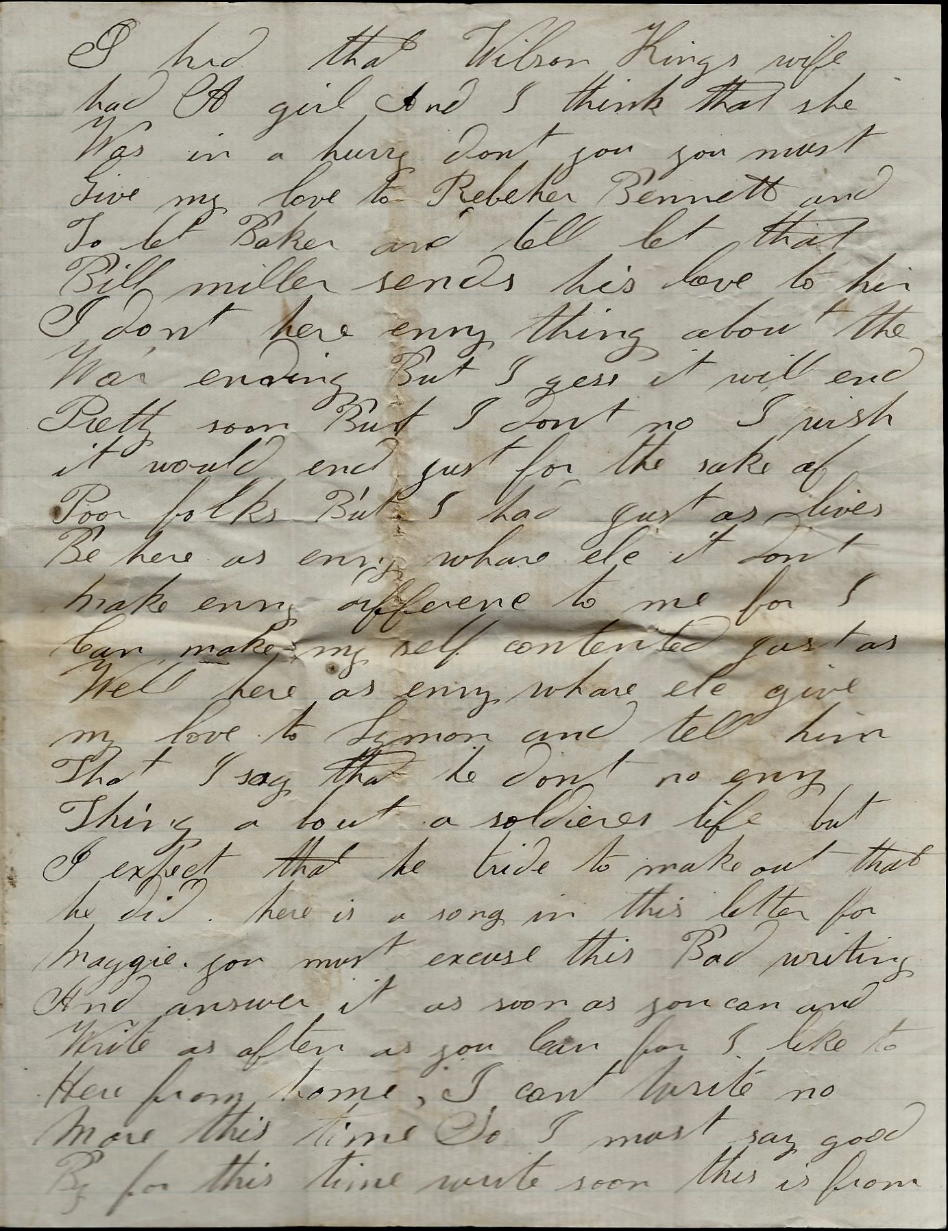 William Miller wants you to try for him too and if he can get them together, I wish he would. But if he can’t, we will take them anywhere. I wish you would write as soon as you can and let me know what he will do about it. I can’t think of no news but if you hear any, you must write. Give my love to all of the folks and take a good share of it yourself. I can’t write no more at present so I must say goodbye.