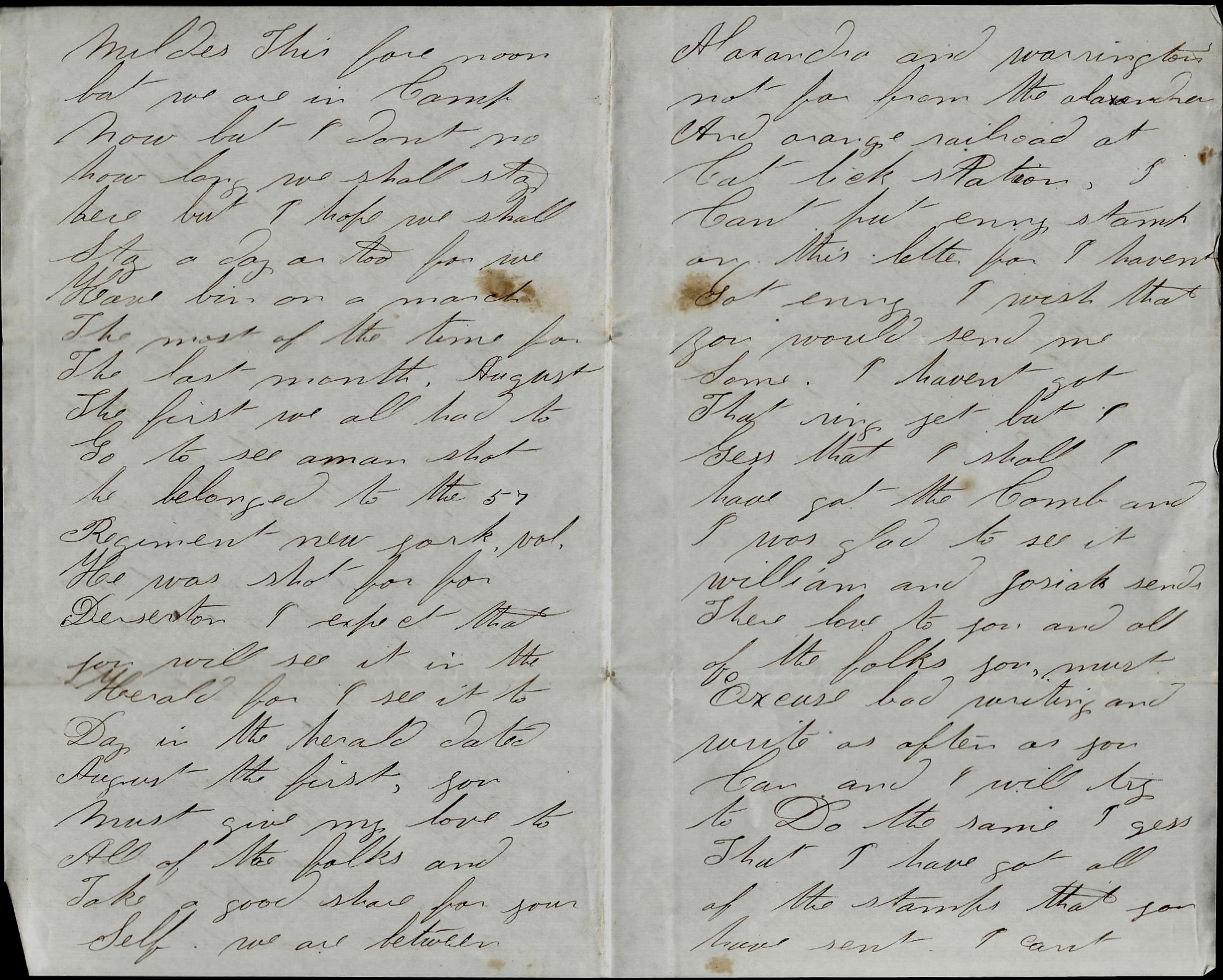 August the first we all had to go to see a man shot. He belonged to the 57th Regiment New York Vols. He was shot for desertion. I expect that you will see it in the Herald for I see it today in the Herald dated August the first. You must give my love to all of the folks and take a good share for yourself. We are between Alexandria and Warrington, not far from the Alexandria & Orange Railroad at Cat Lick [Catlett’s] Station.