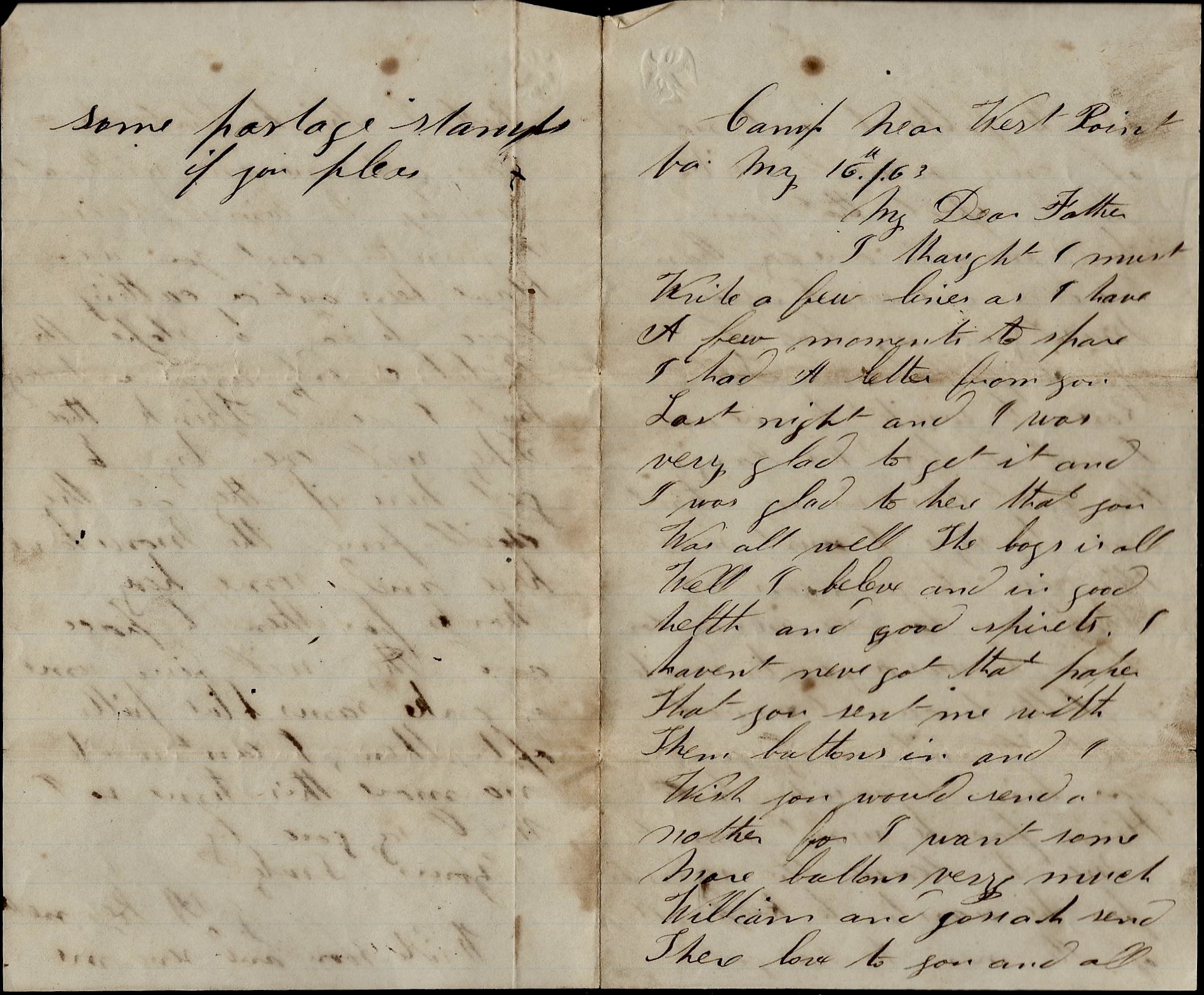 I now take the pleasure of writing a few lines to let you know that I am well and I hope that these few lines will find you the same. I expect that we shall leave here tonight or tomorrow but I don’t know where we are a going to—some good place I hope. They say that Vicksburg is ours and I hope it is. I don’t know of much news to write this time but I hope the next time I write I can say that the war is almost over. But I don’t expect that I can say so. I am in hopes that the summer will close it up. For my part, I have got enough of soldiering for the present, although I am willing to do my duty in defense of my country. They say that Hooker is a going to try again and see what he can do and I hope he will have good success and go through [to Richmond] this time.