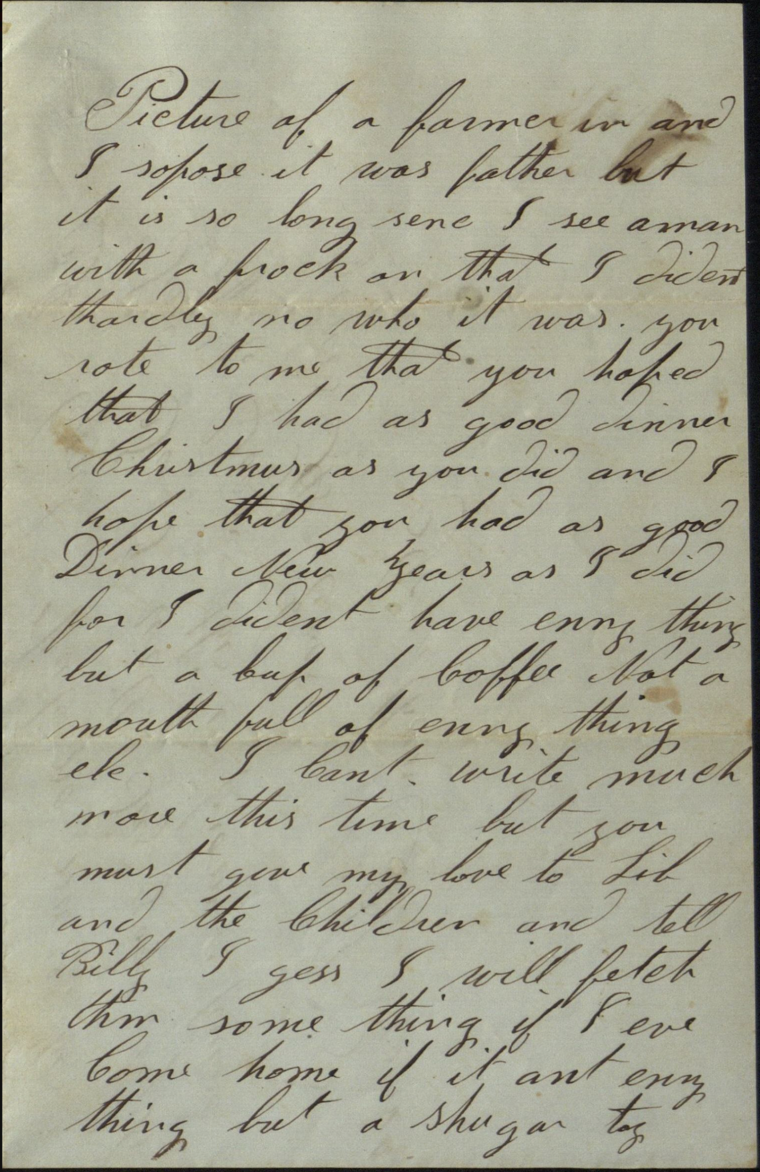 William Miller is a writing to you for the first time, I guess, but I don’t know. You said in your last letter that Sophie was a going to send one that day but I haven’t got it yet. But I hope I shall pretty soon. I had a letter from father the other day and it had mother’s picture and the childrens in. I was glad to see them and I wish that you would get yours and Elizabeth’s and send to me for I want to see you very much and I will send you the money if you will get them. I wish you would send them as soon as you can. I had rather have them on a card if you can get them. Never mind the cost. I will pay you for them. Please get them.